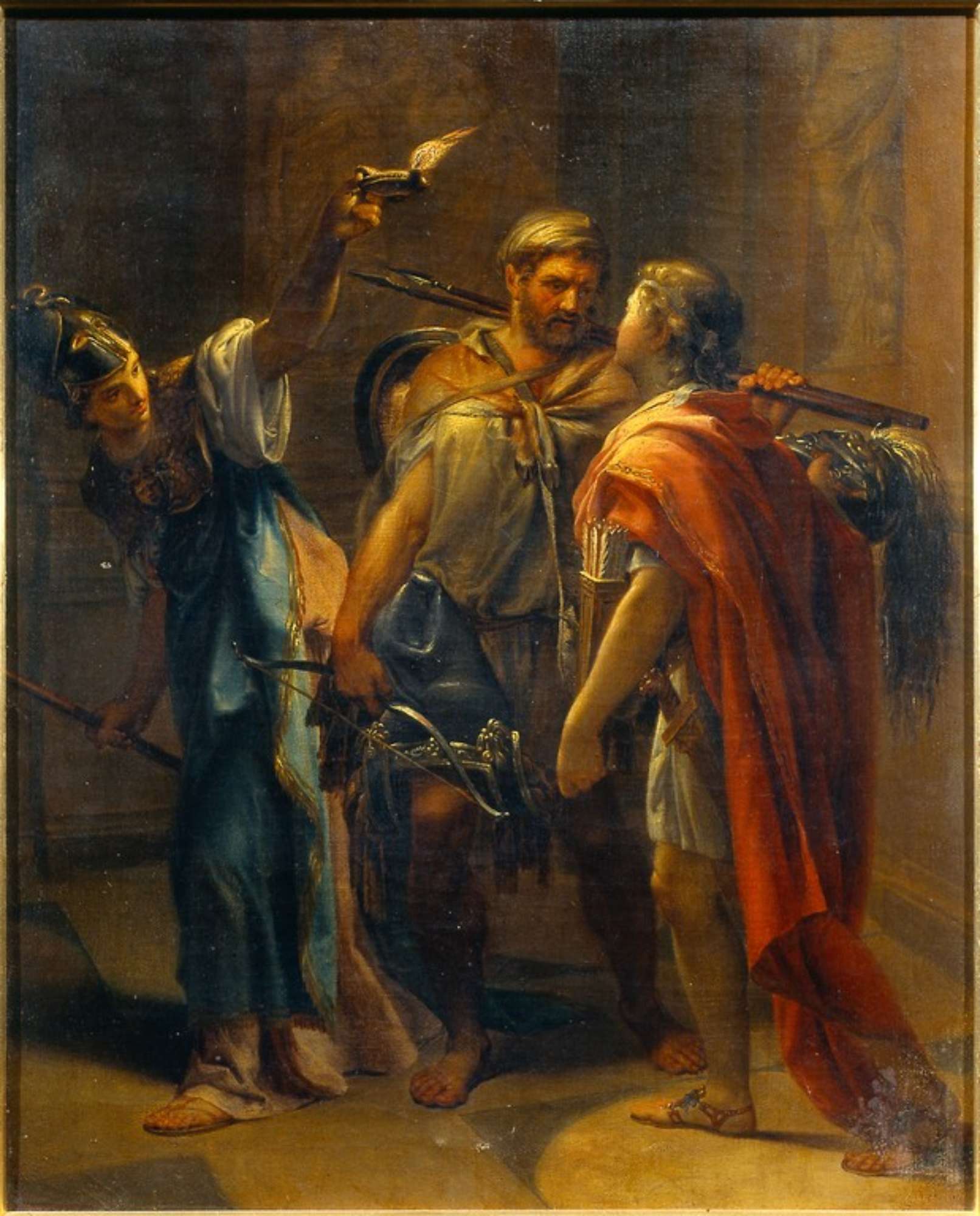 Le due tele (presente scheda e nctn 00000167a), modelletti per opere di maggiori dimensioni, sono state eseguite dall’artista per una comune occasione di committenza. Sono infatti state ordinate dal lucchese Carlo Conti, figura di rilievo nella conduzione della locale Accademia di Pittura e Disegno, protettore dello stesso Nocchi. Conti sarebbe morto suicida nel 1794, proprio quando il pittore si apprestava a concludere le opere commissionategli (GIOVANNELLI 1989, pp. 58-63). L’opera in esame, Il ritorno di Ulisse a Itaca, è il modelletto per un dipinto attualmente di ubicazione ignota già di proprietà della Granduchessa di Toscana. A Giovannelli si deve la pubblicazione di un disegno dell’artista lucchese, conservato all’Istituto Nazionale per la Grafica a Roma, da considerare quale momento di ulteriore precisazione stilistica per i volti e altri particolari anatomici dei personaggi in precedenza delineati nel modello su tela (GIOVANNELLI 1989, p. 58). E ancora Giovannelli (ibid., p. 60) a ricordare per il tramite di testimonianze documentarie il soggetto dell’opera: Ulisse “guidato da Pallade in abito incognito, è in compagnia di Telemaco, onde potersi scermire degl’insolenti Proci infesti alla sua casa e moglie. E questo soggetto, è dipinto a lume di notte, per cui spicca un molto brillante effetto”. Il dipinto veniva erroneamente ricordato nel catalogo della Galleria Campori del 1929 come raffigurante la “partenza per la guerra”. Il percorso conservativo dei modelletti della Collezione Campori è stato ricostruito a partire dalla presenza degli stessi nello studio del pittore. Dopo la morte di questi, i due dipinti venivano valutati insieme ad altri bozzetti dal figlio Pietro in base alle indicazioni di prezzo già fornite nel 1812 da Camuccini, Agricola e Pozzi per la divisione tra gli eredi. A palazzo Campori le opere sarebbero invece giunte passando dalla collezione modenese del marchese Calori Cesi, poi Ferrarini (La Galleria Campori, 1929, p. 38). Nei cataloghi della Galleria Campori sia Il ritorno di Ulisse che Il pianto di Ulisse (nctn 00000167a) venivano erroneamente attribuita a Pompeo Batoni, in sintonia con quando si indicava per quest’ultimo già nel 1922 in occasione della sua esposizione alla mostra fiorentina della pittura italiana del Sei-Settecento (Mostra della pittura … 1922, p. 29).