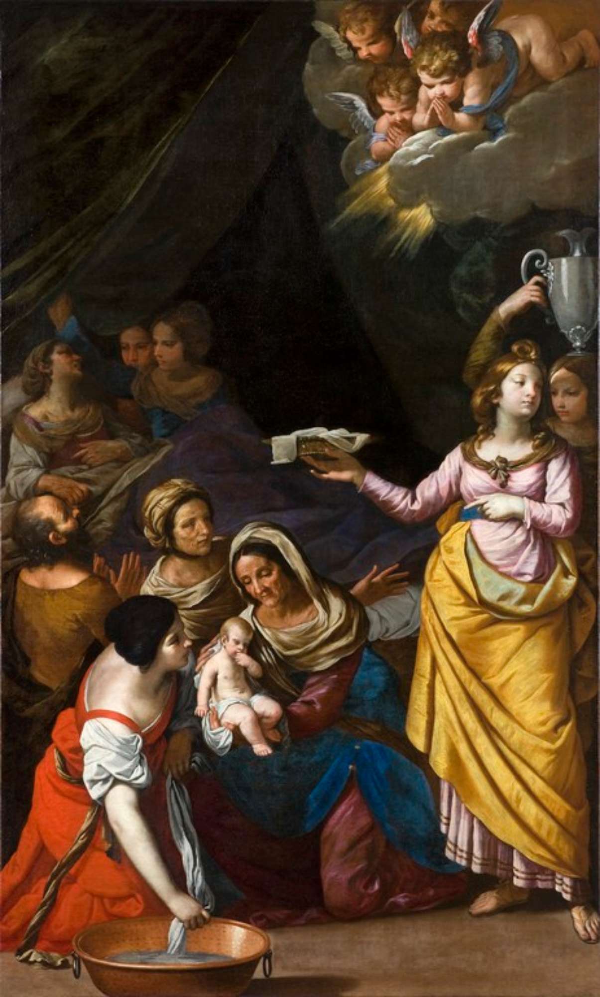 In primo piano possiamo due ostetriche, la più anziana fra le quali tiene fra le braccia la piccola Maria e la porta verso il lavacro, dove una giovane donna è già in attesa con uno straccio bagnato.