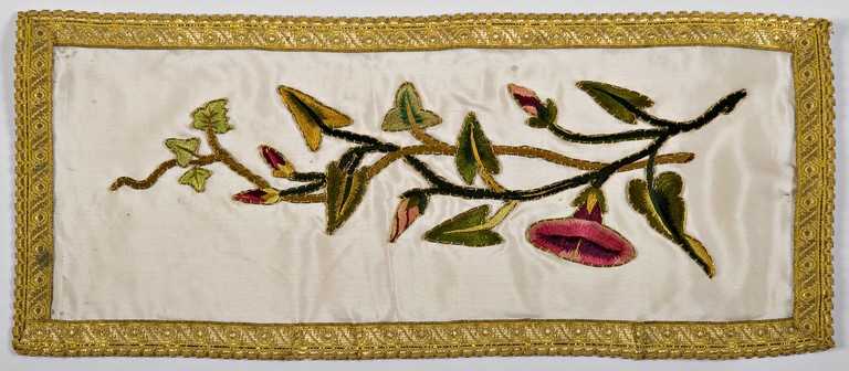 Ricamo policromo, probabilmente ottocentesco, applicato su nuovo supporto in seta avorio e contornato con cordoncino dorato. Il ricamo raffigura un convolvolo intrecciato ad un tralcio di edera.