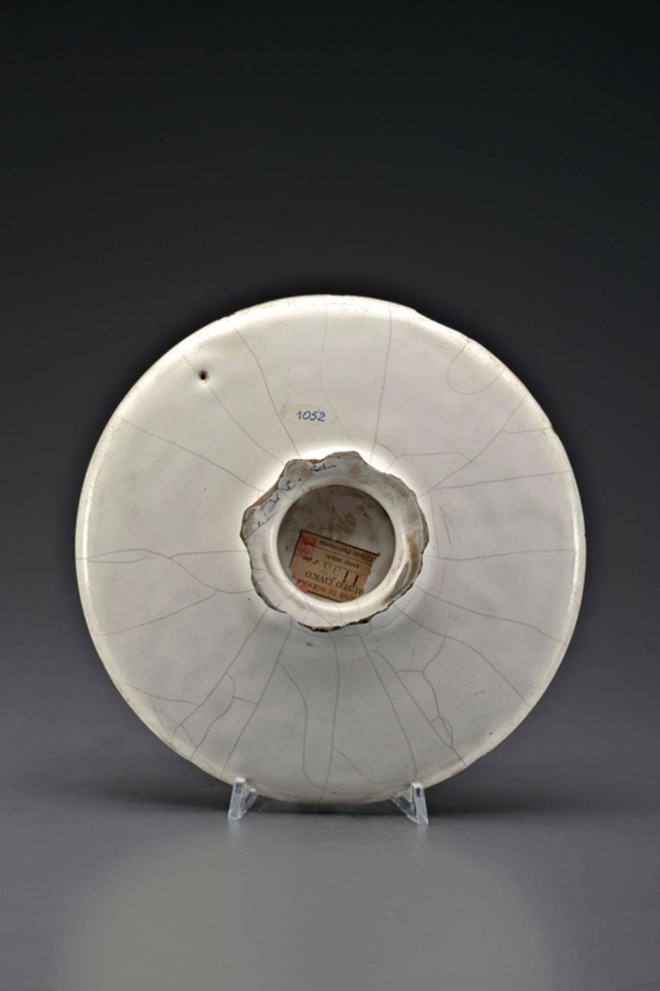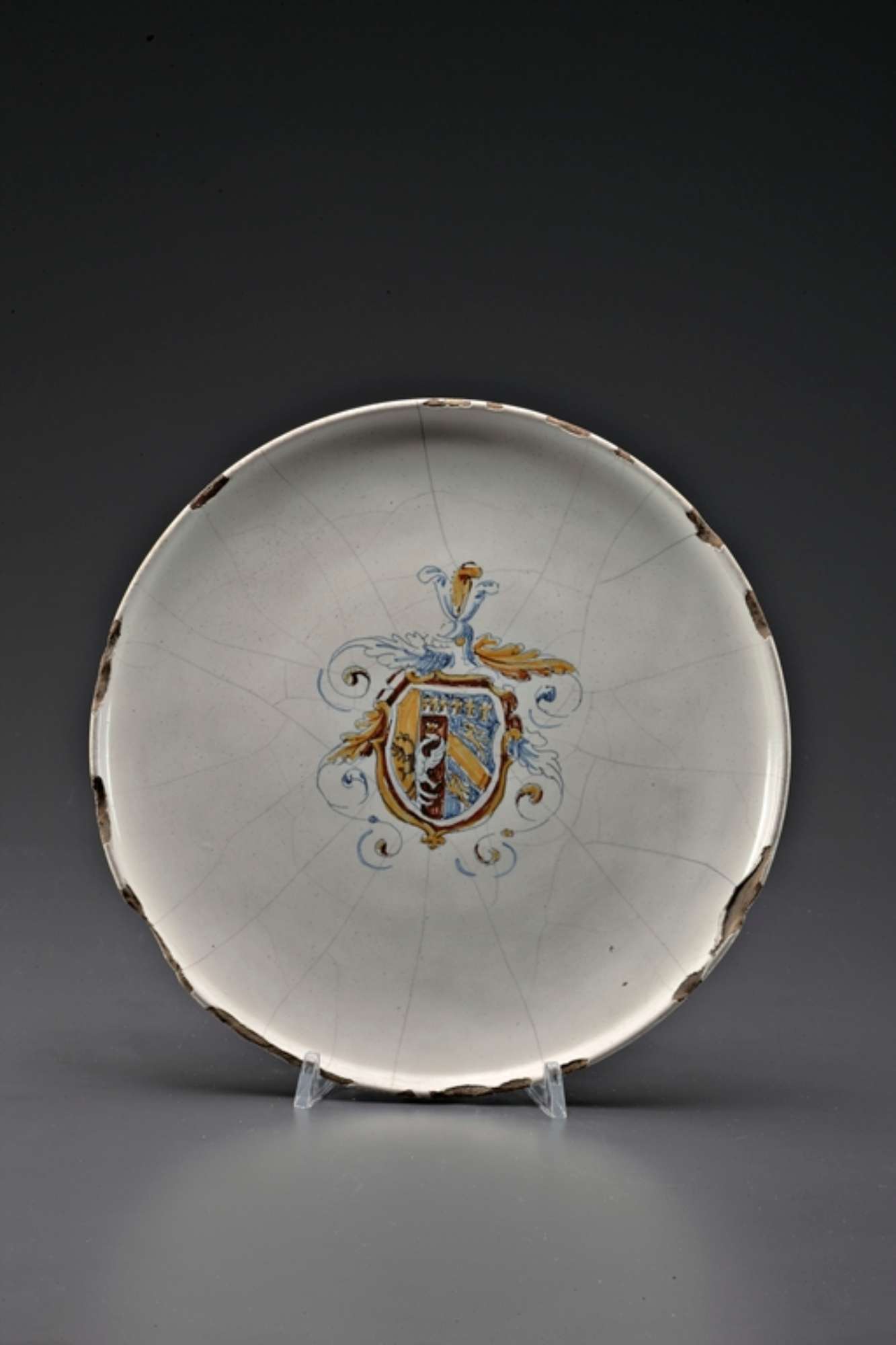 Alzata a fondo piano con orlo leggermente svasato su piede anch'esso svasato. Sul recto, al centro, è dipinto uno stemma recante le insegne dalla famiglia Grassi accoppiate ad altre non identificate, sormontato da elmo piumato con piume e girali ai lati. Sul verso, sulla base del piede, siglatura di bottega leggibile solo in parte per un'ampia lacuna del piede. La decorazione è dipinta in arancio, blu e giallo su smalto bianco.