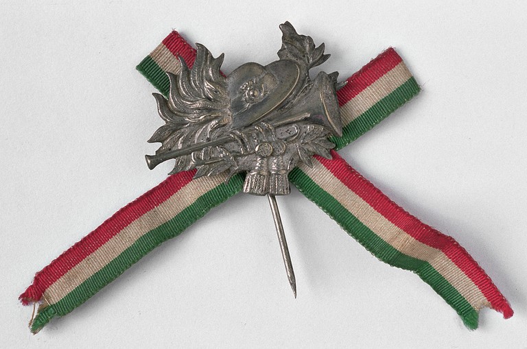 La decorazione mostra sopra un letto di foglie d'alloro il cappello dei bersaglieri e la tromba con due nappine. Sul retro della decorazione, un passante a cui è legato un nastro di tessuto tricolore. La decorazione è fissata ad un supporto rivestito di panno blu assieme alle decorazioni (Cat. nn 401-403). Il pezzo è accompagnato da cartellino ad inchiostro rosso. Appartiene a Domenico Cornazzani.