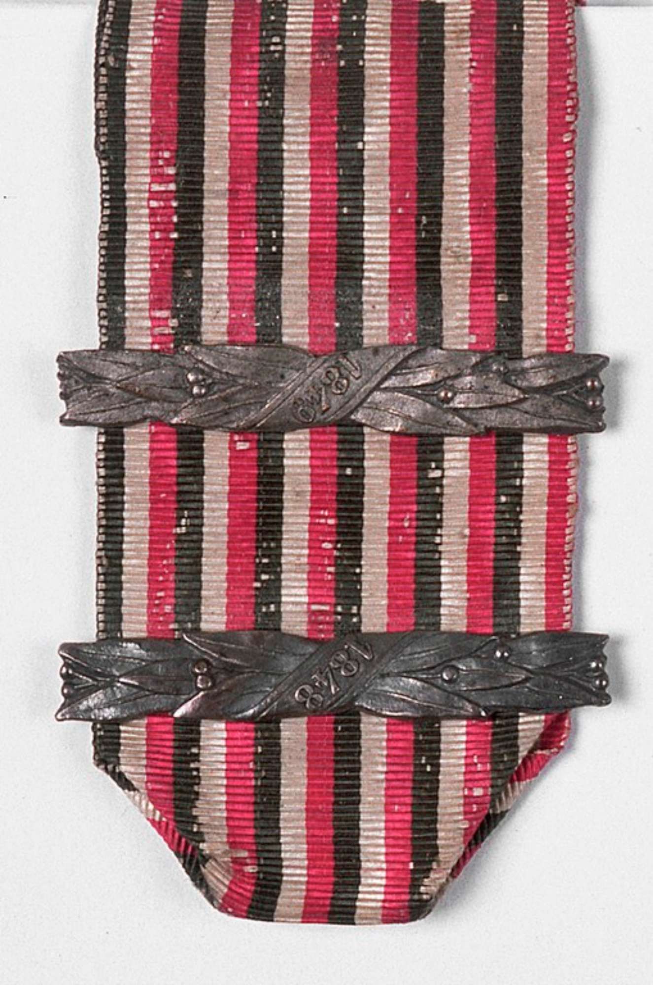 Il nastro in gros grain alterna fasce verticali in verde, bianco e rosso. Al nastro sono fissati due fermagli, formati da foglie d'alloro e con un cartiglio recante una data. Il nastro è fissato ad un supporto rivestito di panno verde assieme alle medaglie Cat. nn. 441, 442 e 444.Donativo Odoardo Pirazzoli.