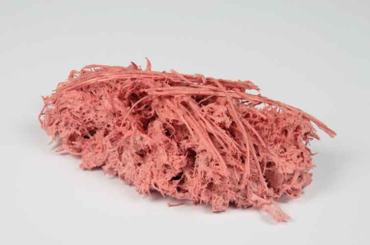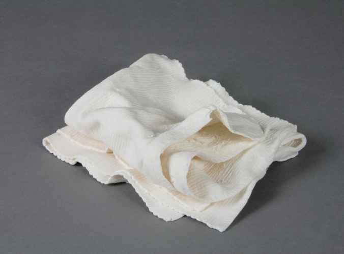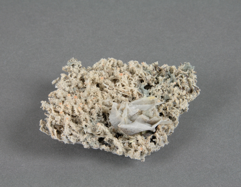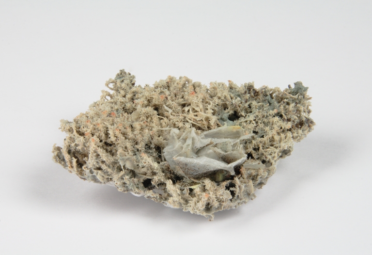 Piccola scultura informe, realizzata completamente in porcellana, ad imitazione di elementi vegetali con residui di plastica.