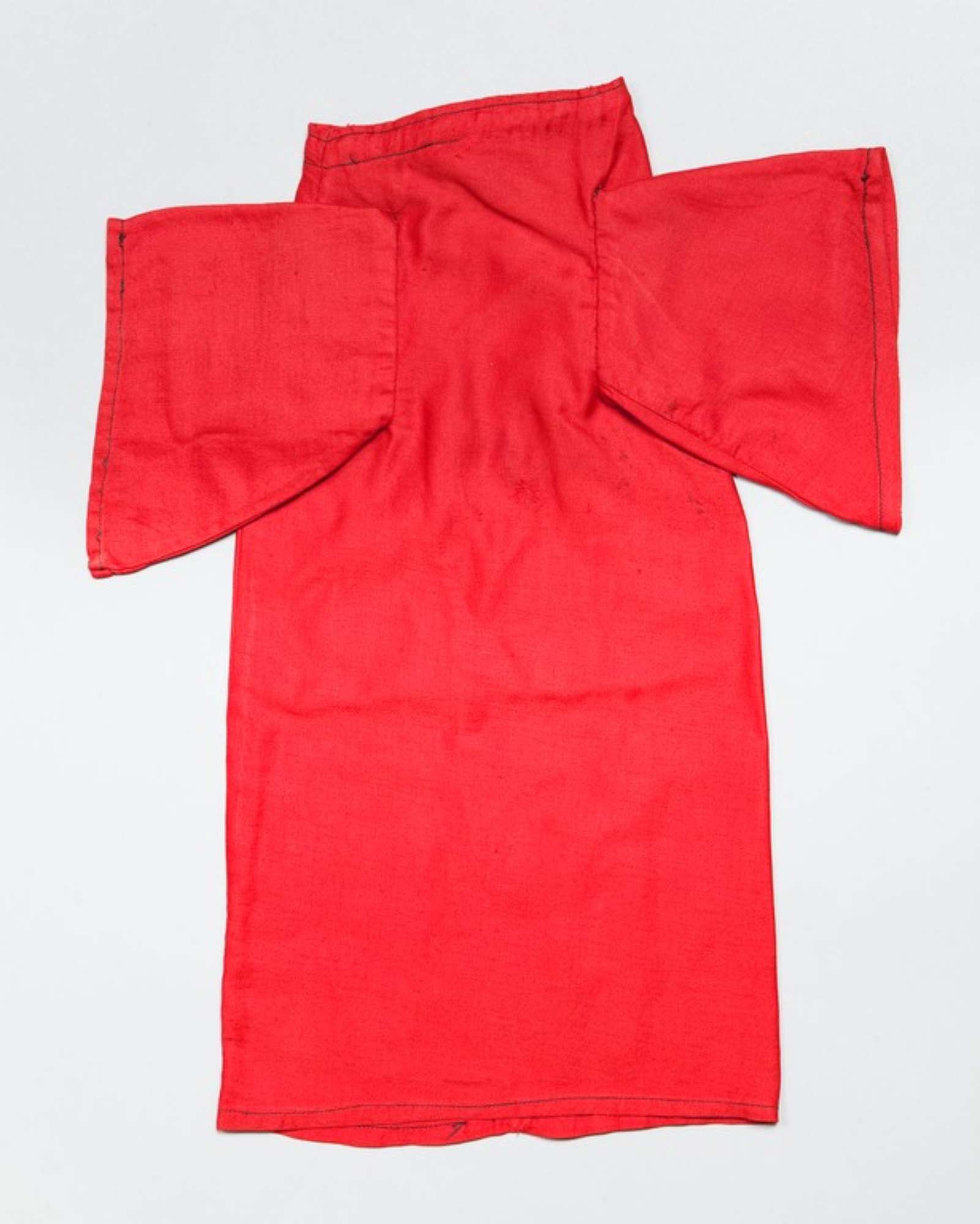 Il vestito è di cotone rosso. Due lacci di cotone bianco sono fissati al collo.