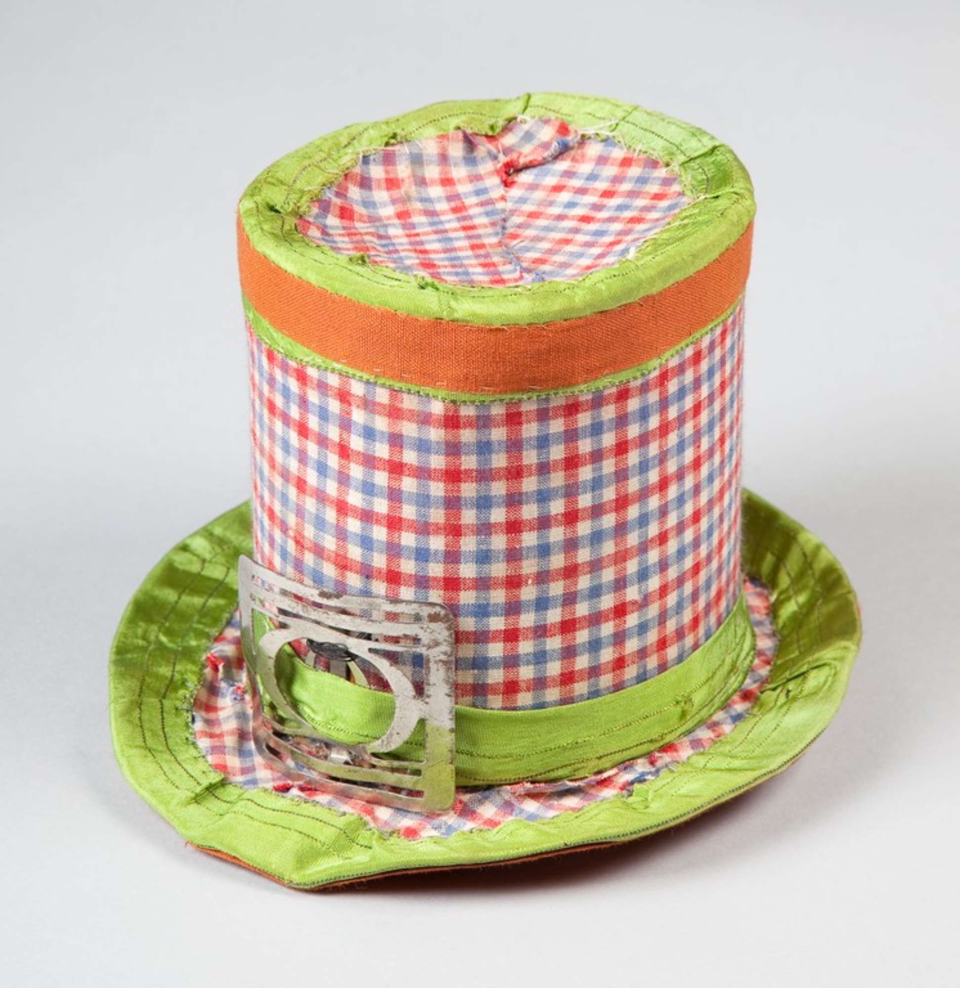 Il cappello a cilindro è di cartone sagomato e rivestito di tela di cotone a quadretti colorati. Il cappello è rifinito con passamaneria di cotone verde e arancione.