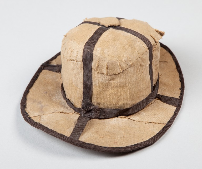 Il cappello è di cartone sagomato e rivestito di tela di cotone color cachi. Il cappello è rifinito con passamaneria di cotone marrone.