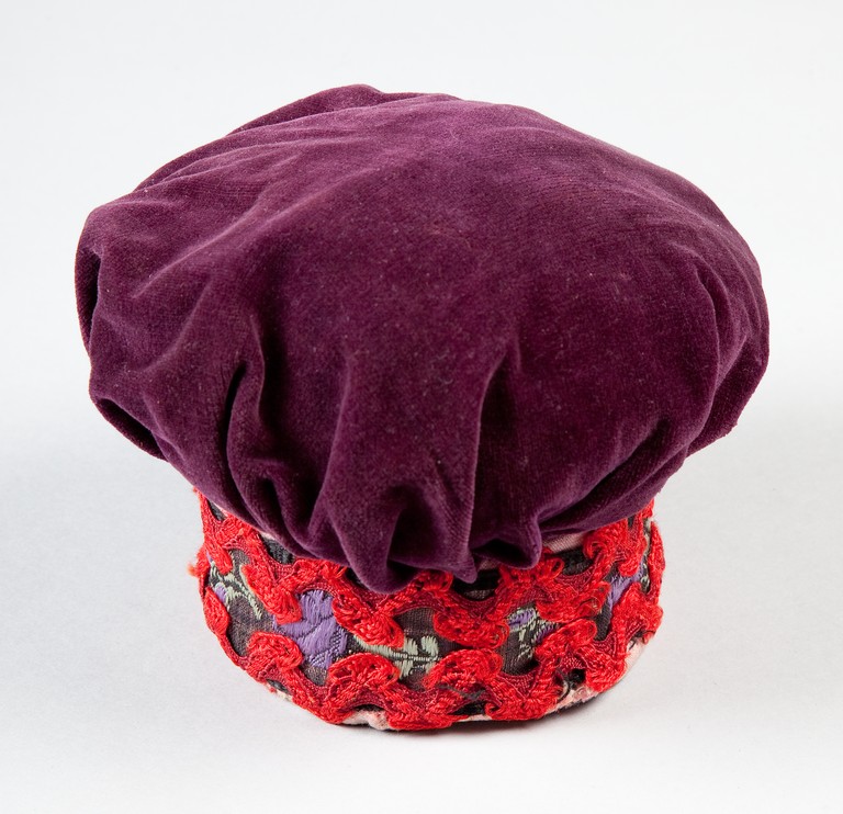 Il cappello è di velluto porpora ed è ornato alla base con passamaneria di cotone di diversi colori.