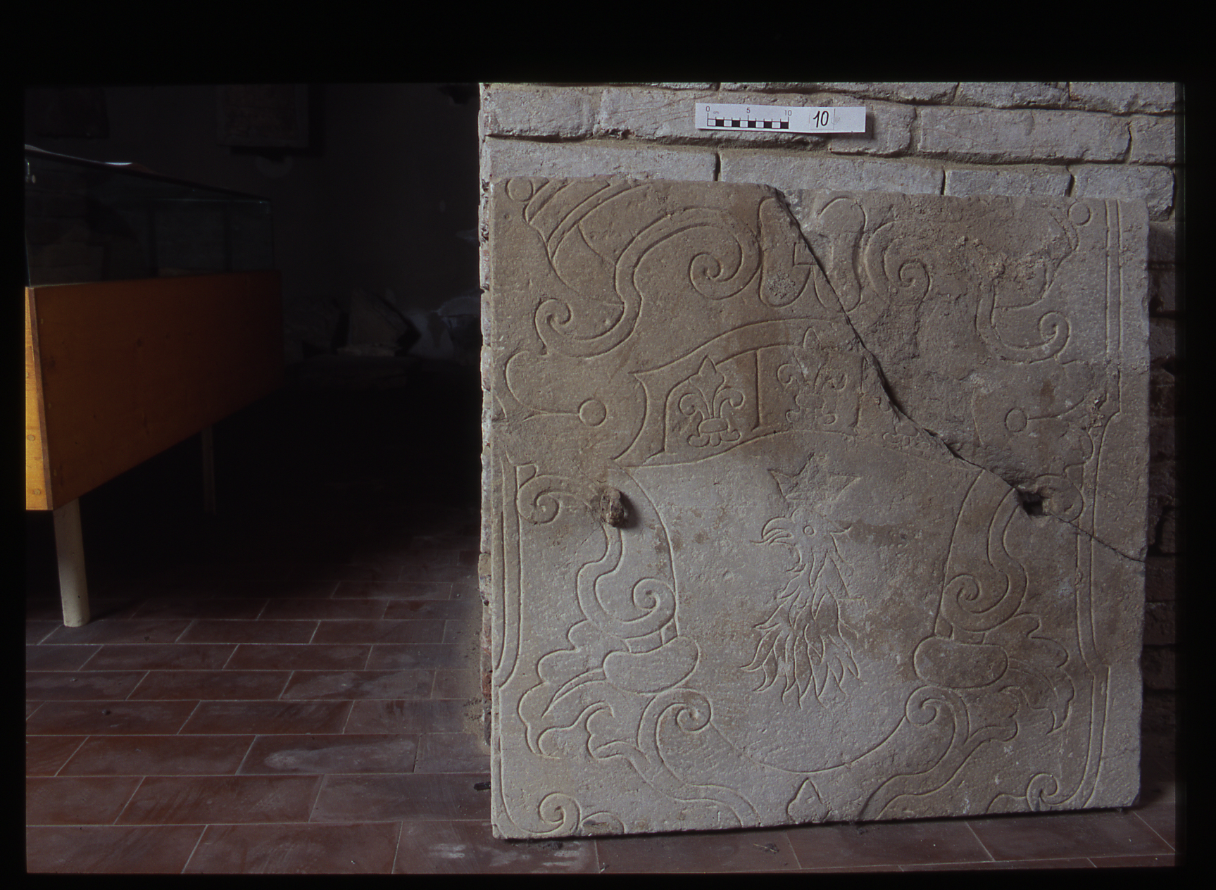 La forma dello stemma a volute e cartocci, conferma ulteriormente una datazione al XVI secolo.