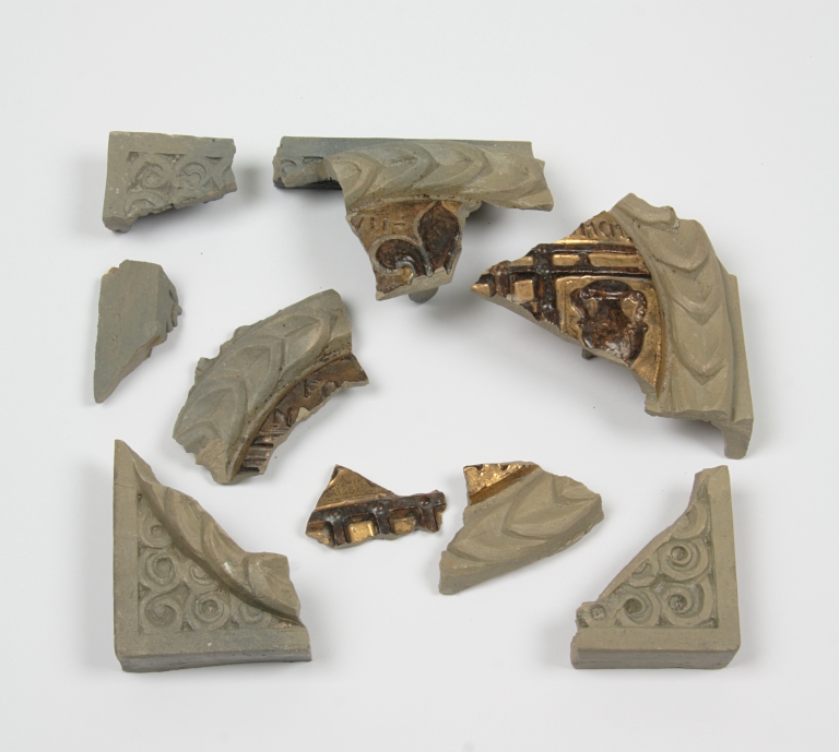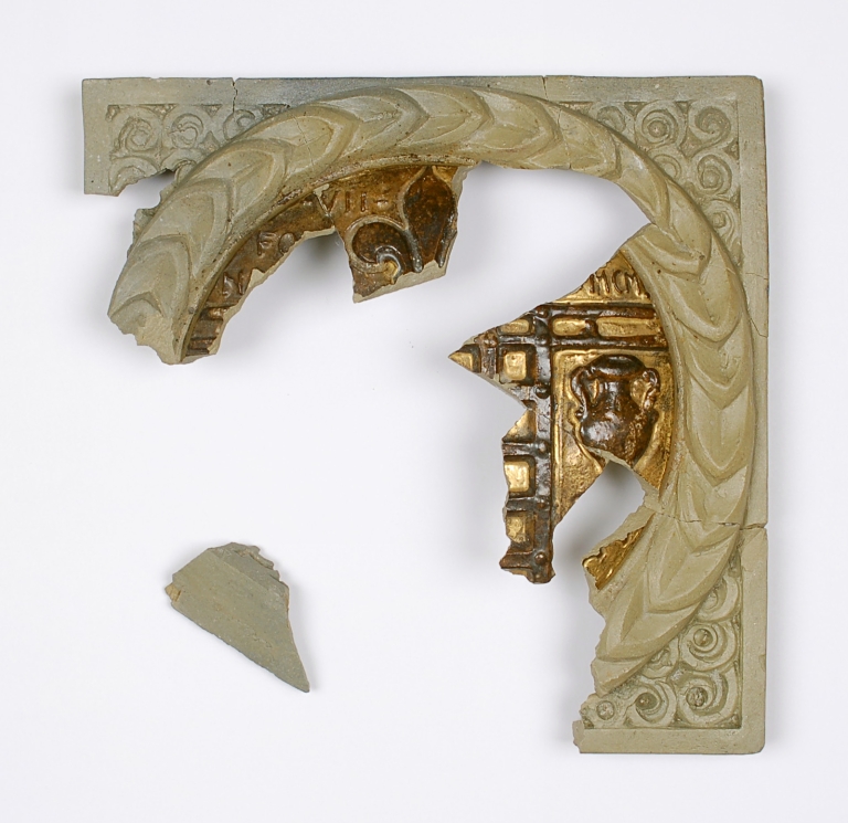 Si tratta di una formella che riporta il marchio della fabbrica, qui solo visibile parzialmente. Dipinta in bruno e oro.