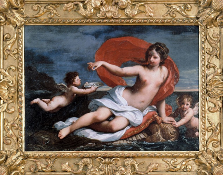 Nella ricchissima cornice originale, vero capolavoro di intaglio, le conchiglie e i delfini, alludono al tema marino trattato nel dipinto.