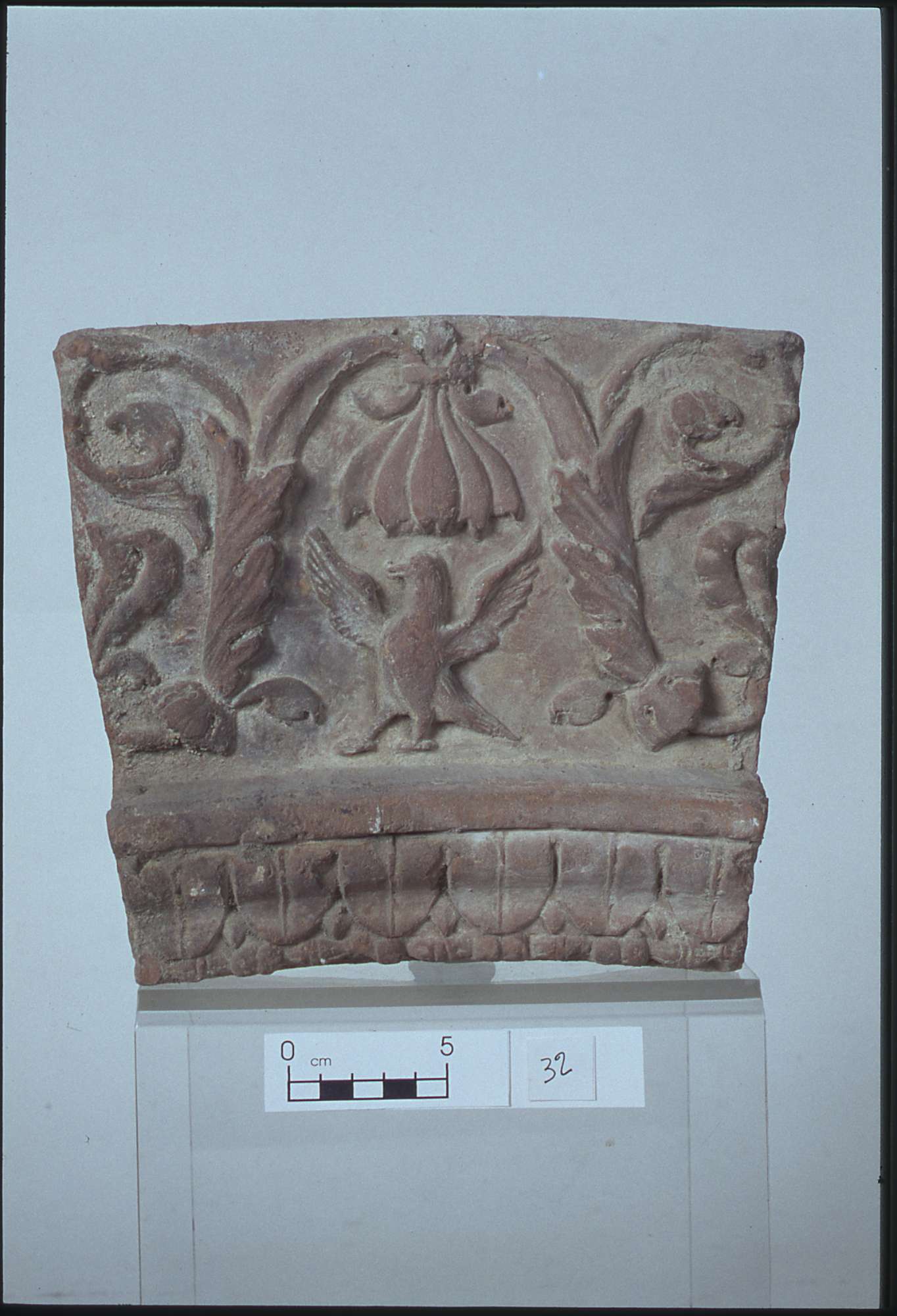 Formella curvilinea, componente di una cornice d’arco. Si inseriva nella cornice in modo da lasciare in vista solo il piatto del laterizio, costituendo un elemento unicamente decorativo e non strutturale. Il piatto presenta una bella decorazione con un fregio ondulato di foglie d’acanto con palmette contrapposte. All’interno dei girali vegetali si trovano alternati un uccellino dal volo spiegato e dei girali più sottili volti a spirale, che si di partono dal tralcio centrale. La cornice inferiore è più sporgente rispetto al piano di fondo, composta da un listello piatto e da una fascia di fogliette, perle e fuseruole.