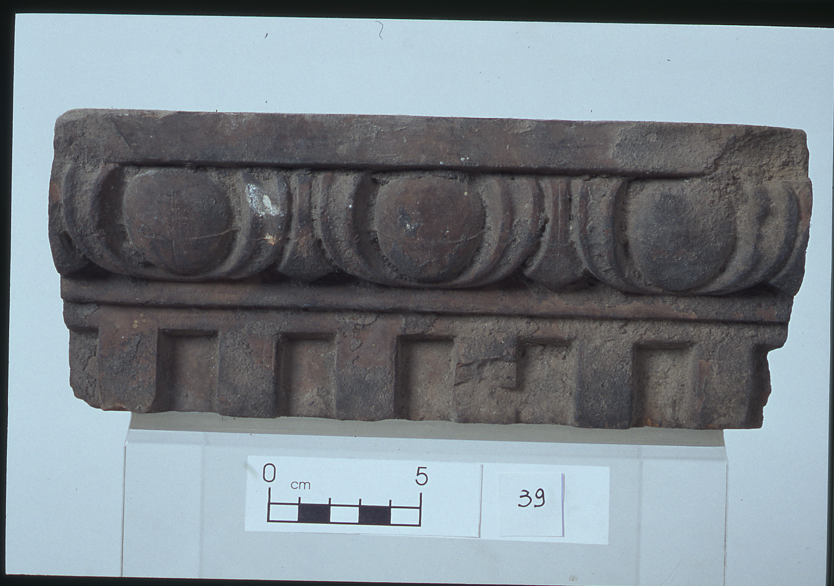 Elemento in laterizio dalla forma parallelepipeda, con decoro sul piatto frontale, composto da una fascia di ovoli e dentelli. I bordi sono lisci ed il decoro netto, evidentemente ottenuto tramite foggiatura entro modani.