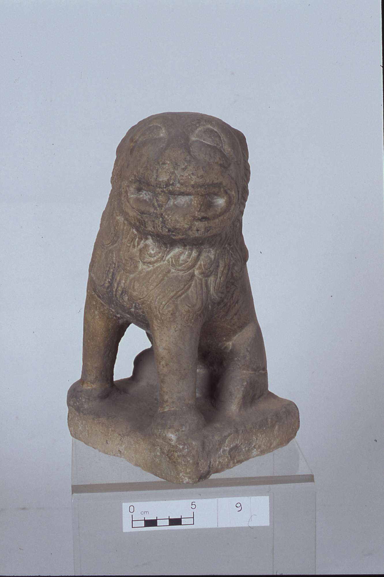 Piccola scultura, alta 30 centimetri, raffigurante un leoncino eretto sulle zampe anteriori, con le fauci spalancate e l’espressione ferina ai limiti del grottesco. La testa, incorniciata da una criniera a ripetitivi riccioli, è issata su di un corpo quasi abbozzato nella parte posteriore, molto più semplificato e sproporzionato rispetto alla fronte, con unico dettaglio la coda, avvolta sulla schiena dell’animale.
