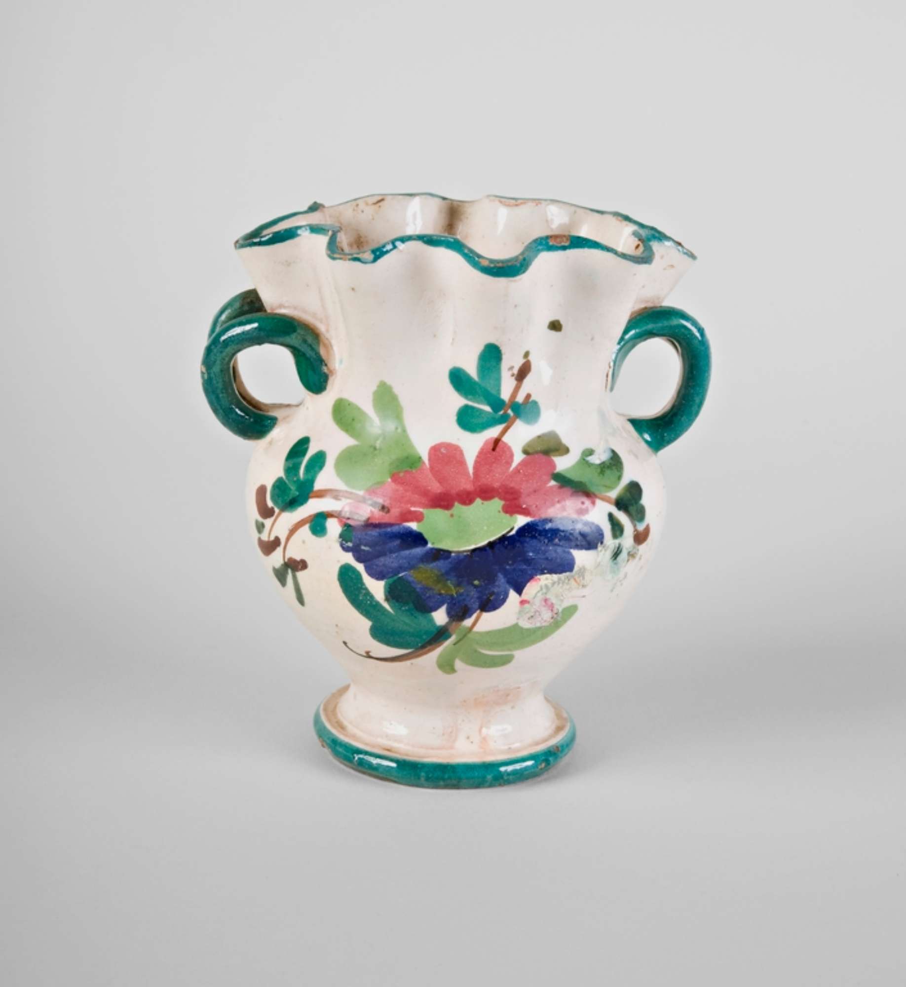 Vasetto biansato con decorazione a fiore rosso e blu. Piede, collo e anse sottolineati in verde.