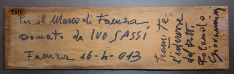 Nel retro a pennarello nero è scritto "Per il Museo di Faenza/ Donato da IVO SASSI/ Faenza 16-4-013/ tramite/ l'interesse/ del Dott./ Rolando/ Giovannini".