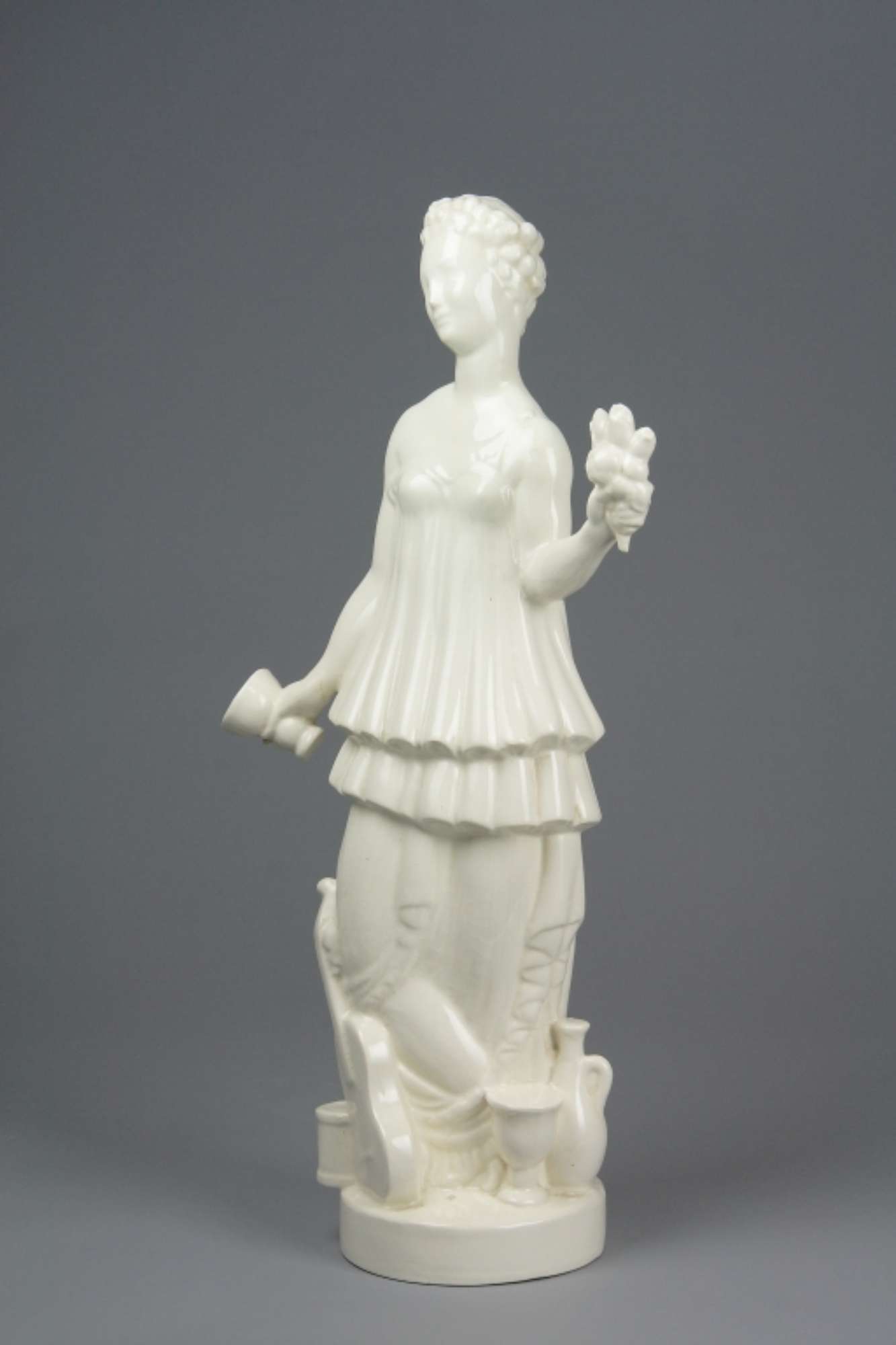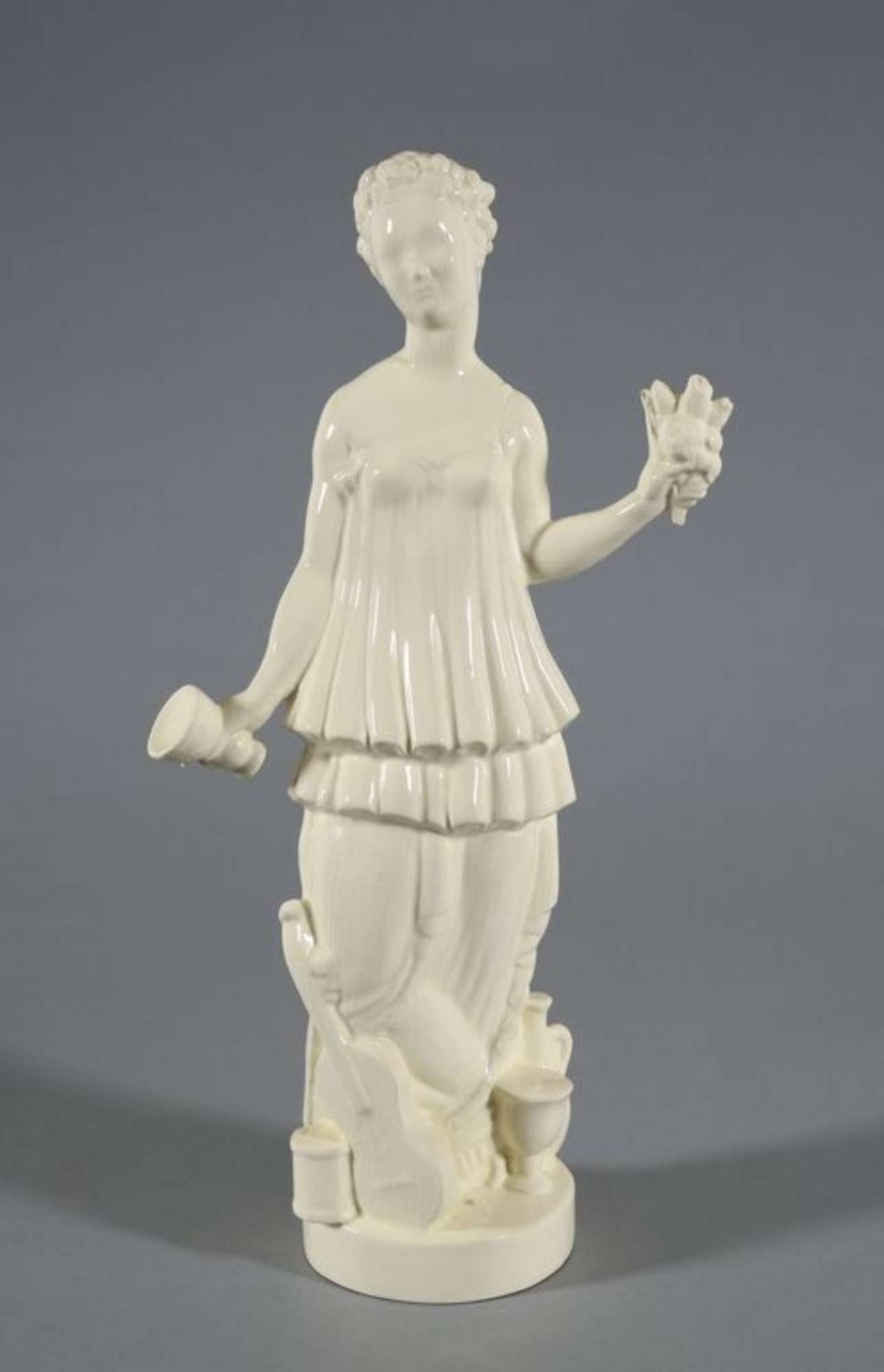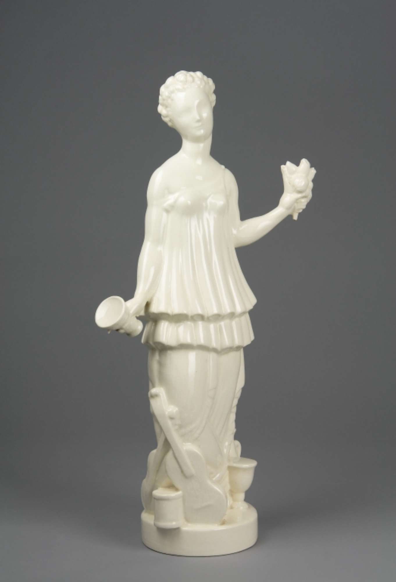 Figura femminile in piedi su base ovale con tunica a due balze sovrapposte mosse da pieghe verticali. La mano destra impugna un calice, mentre la sinistra un mazzolino di fiori. Sulla base, ai suoi piedi una chitarra, una brocca e un grande calice.