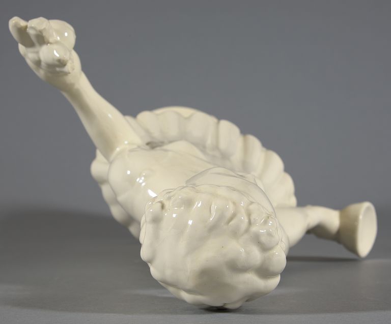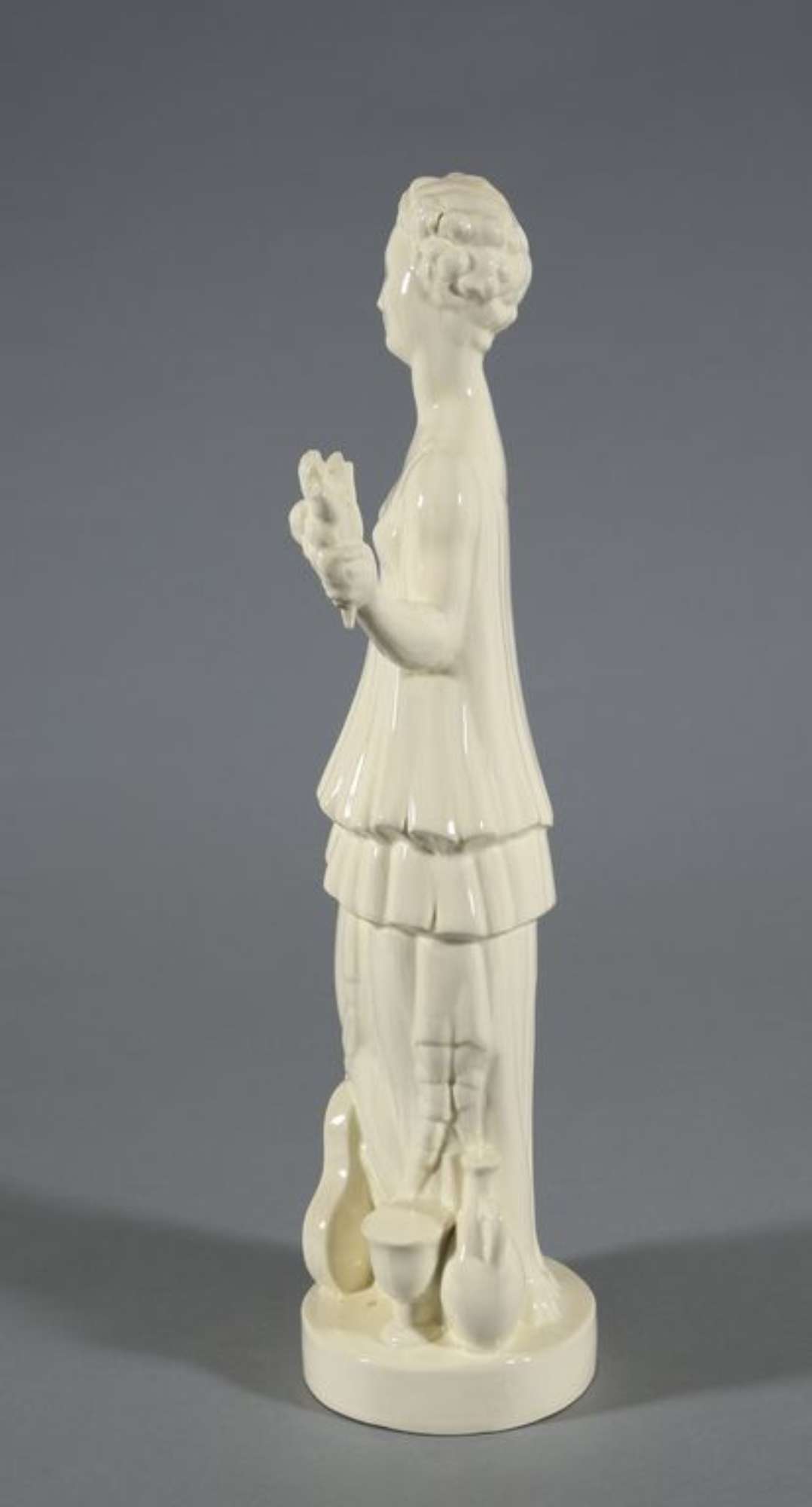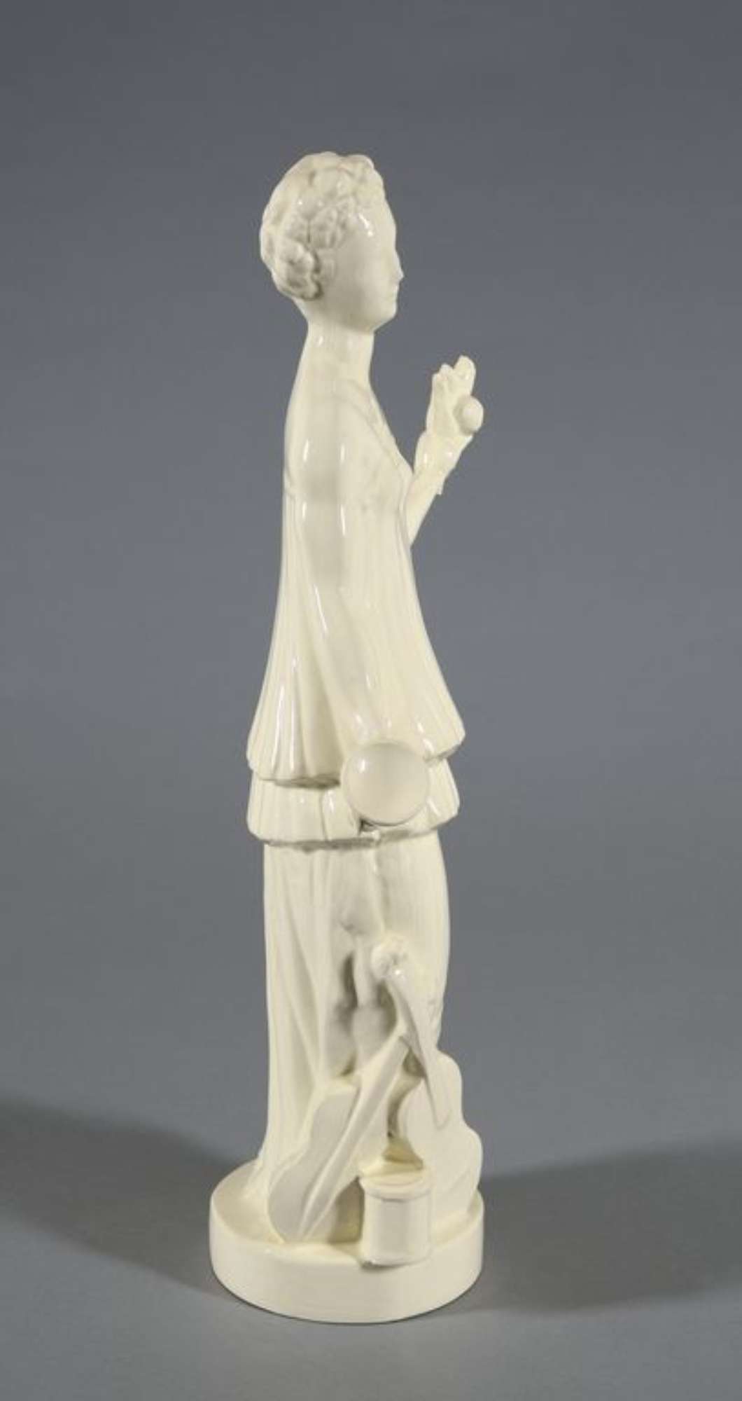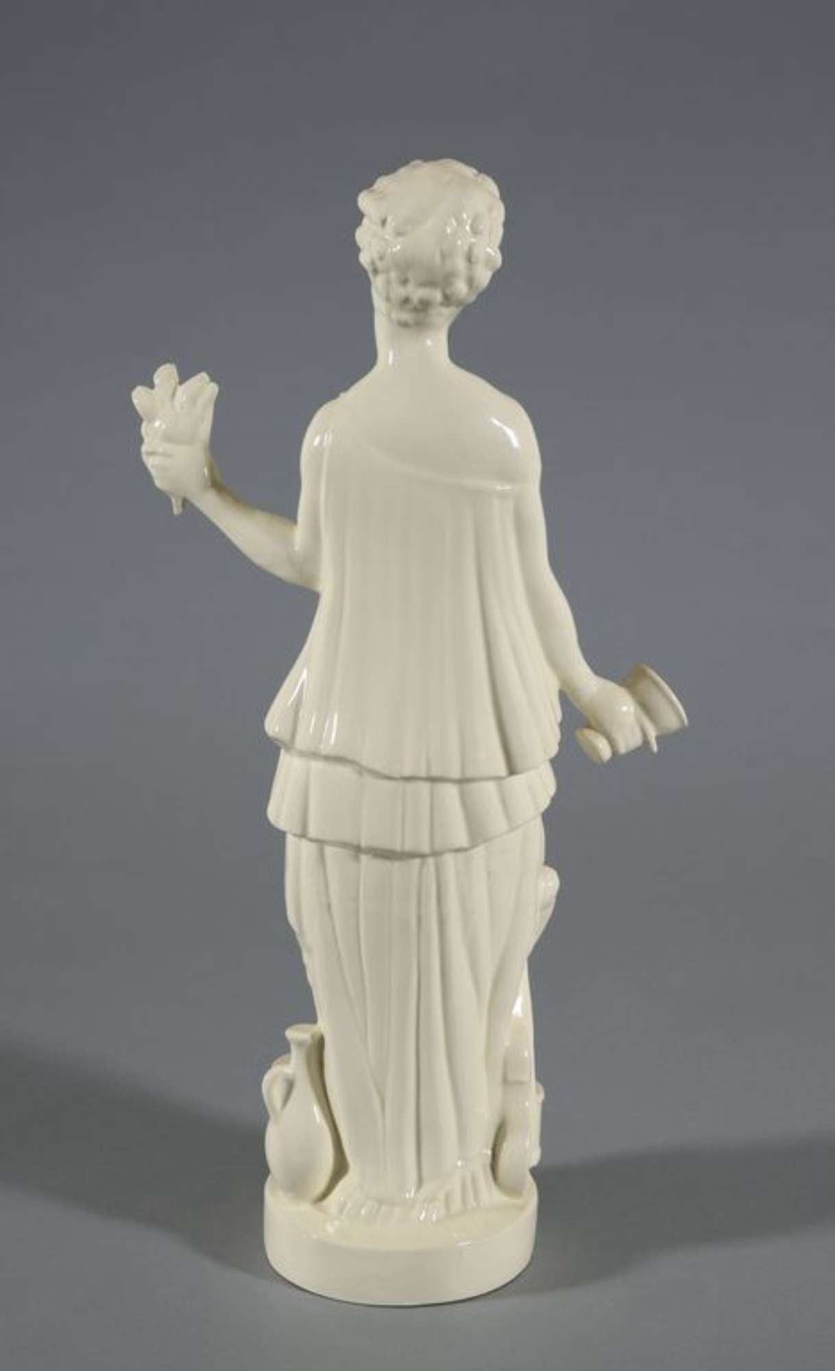 Figura femminile in piedi su base ovale con tunica a due balze sovrapposte mosse da pieghe verticali. La mano destra impugna un calice, mentre la sinistra un mazzolino di fiori. Sulla base, ai suoi piedi una chitarra, una brocca e un grande calice.