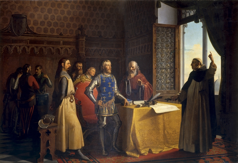 In una dettagliata ambientazione medievale il frate domenicano, in atteggiamento predicatorio, difende la città di Firenze al cospetto del re di Francia Carlo VIII, in armatura con giubba di velluto blu decorata da gigli d'oro.