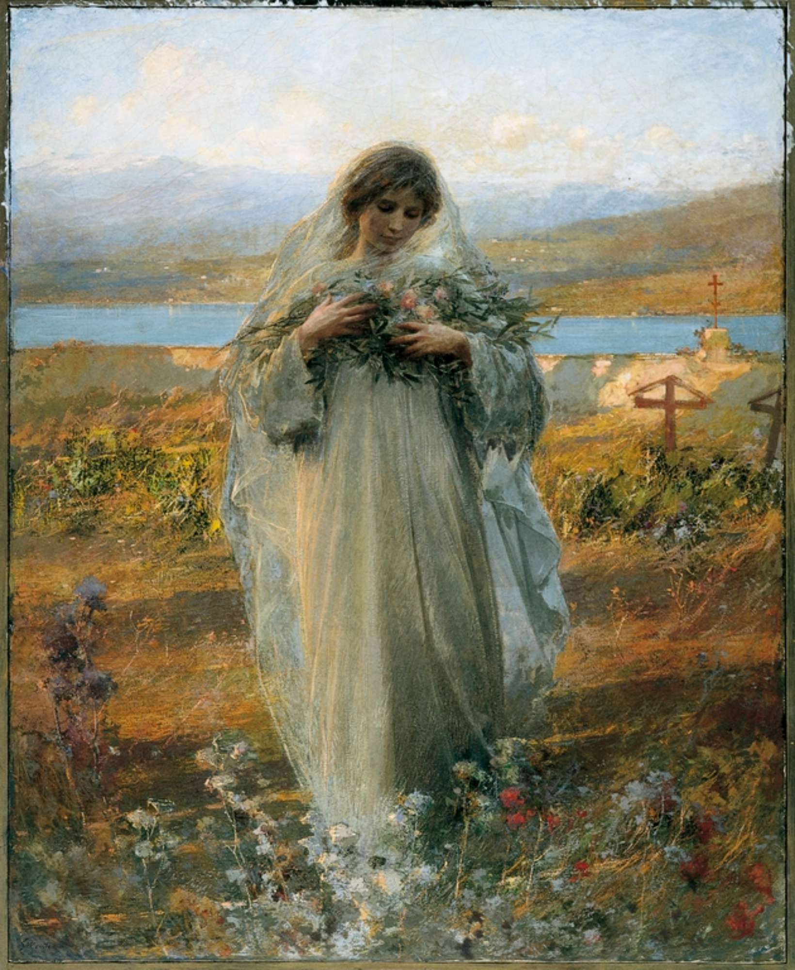 In un campo rischiarato dalle prime ore del mattino, a ridosso di un lago, una giovane vestita di bianco è ripresa in contemplazione mentre tiene un fascio di fiori tra le braccia. La personale trasposizione allegorica della "Pace", esposta nel 1907 alla Biennale di Venezia, dimostra come Mentessi era a quei tempi, oramai preannuncianti le 'avanguardie', fortemente condizionato dal gusto simbolista e liberty (Avanzi 1999, p. 14). In occasione di questa importante esposizione il giudizio sferzante del giovane Boccioni sancì, difatti, l'allontanamento delle giovani generazioni dal suo linguaggio, ritenuto attardato rispetto alle nuove tendenze dell'arte (Toffanello in Da Boldini a De Pisis, p. 50).
