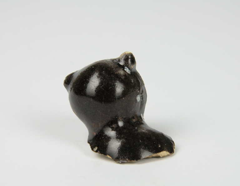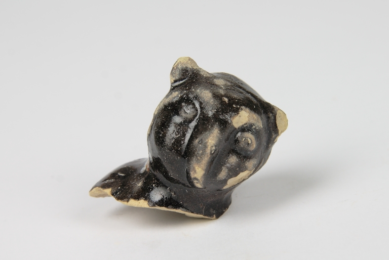 Testa di civetta; rivestita di smalto bruno al manganese, con tocchi di bianco.