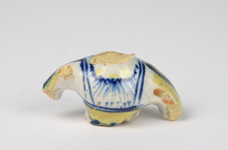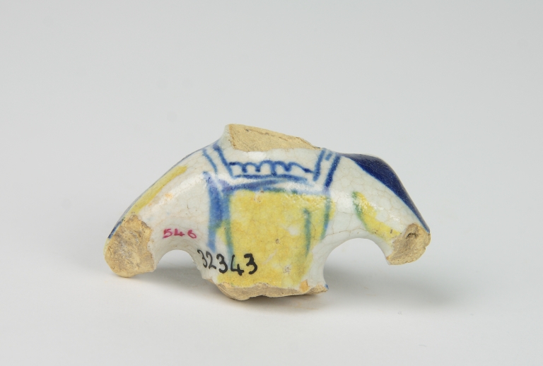 Frammento di busto di dama in abiti rinascimentali; dipinto in blu, giallo e arancio su smalto bianco.
