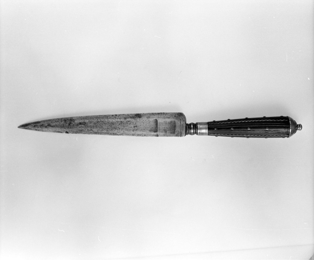 manico solcato da cannellini, sulle liste alcune puntine, cappellotto inciso con bottone sporgente. Ghiera larga e liscia. Nodo largo. Lama dritta a un filo, intaccatura sul dorso