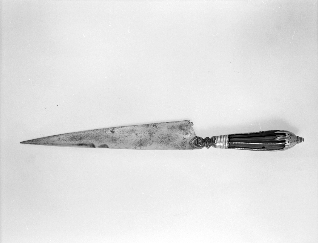 manico tondeggiante diviso a sezioni, cappellotto lavorato a punte, nodo a tortiglione. Lama dritta a un filo, dorso nervato, alla base della lama piccola intaccatura