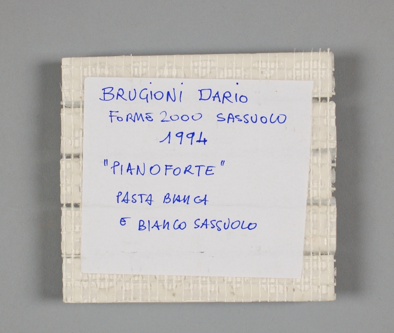 Nel retro è presente la scritta "BRUGIONI DARIO/ FORME 2000 SASSUOLO/ 1994/ "PIANOFORTE"/ PASTA BIANCA/ E BIANCO SASSUOLO".