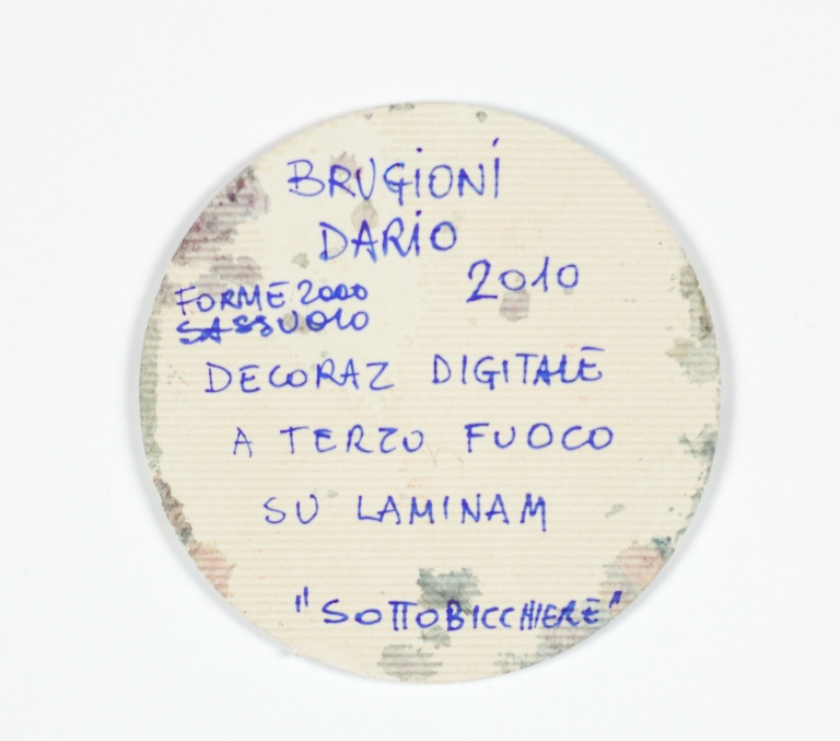 Nel retro è presente la scritta "BRUGIONI/ DARIO/ FORME 2000/ SASSUOLO/ 2010/ DECORAZIONE DIGITALE/ A TERZO FUOCO/ SU LAMINAM/ "SOTTOBICCHIERE".