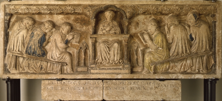Lastra tombale del lettore Bonifacio Galluzzi rappresentato in cattedra tra due ali di sei studenti su banchi di spalle. Tradizionalmente l'opera è stata collegata al paliotto Galluzzi (Inv. 1645) che rappresenta l'Annunciazione.