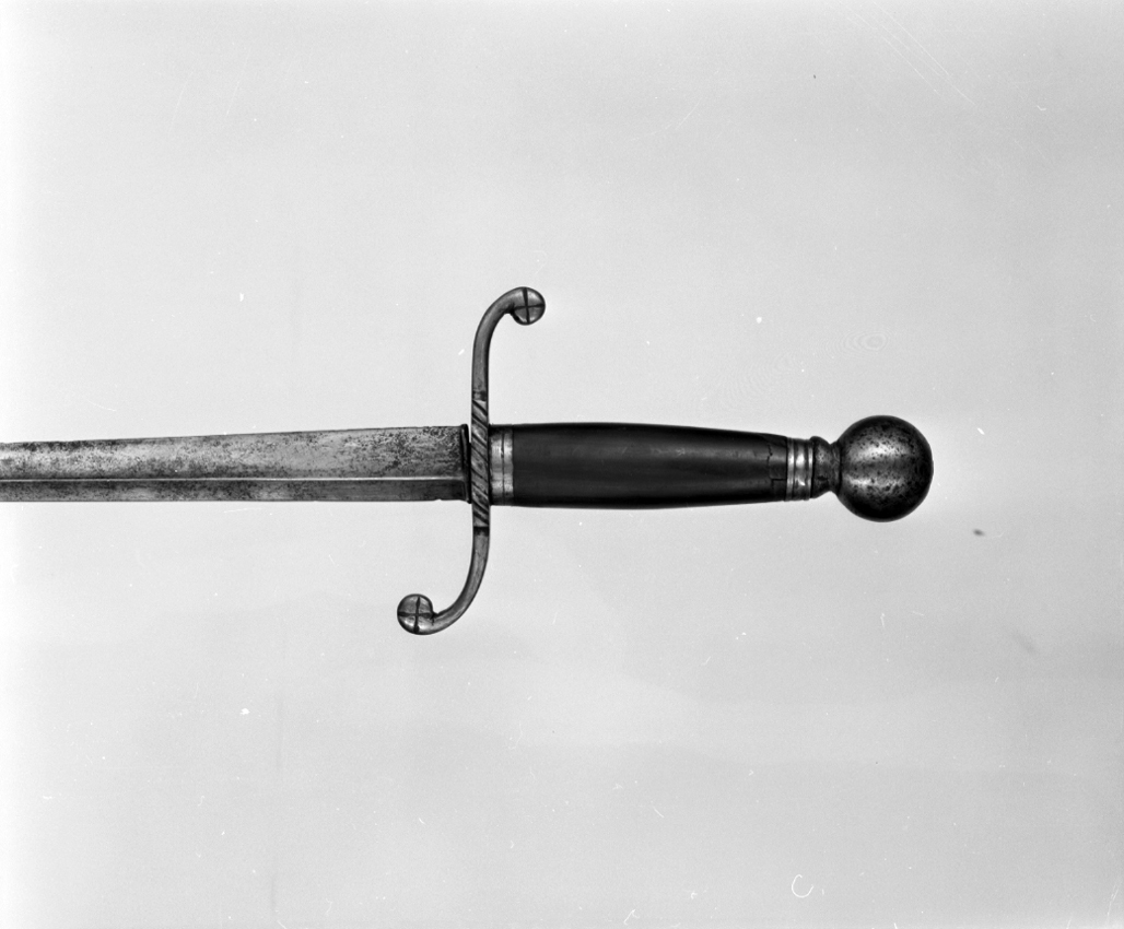 pomo sferico con larga basettina, su impugnatura affusolata e liscia, avente due ghiere all'estremità. Elsa a S con leggeri segni paralleli incisi trasversalmente in corrispondenza della crociera e una X per ogni lobo all'estremità dei due bracci. Lama con cresta