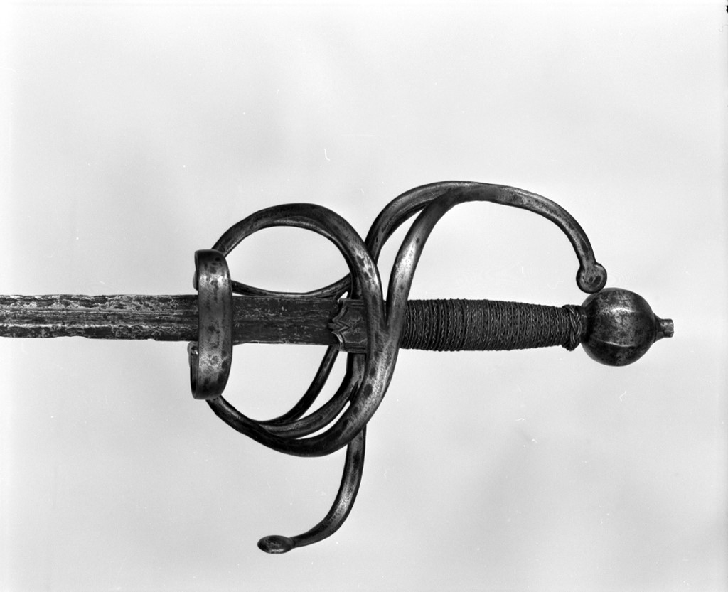 pomo a forma di fico segnato da creste verticali, bottone sporgente a cilindro e basettina. Impugnatura cilindrica fasciata da filo di ferro intrecciato e fermata da due ghiere a treccia. Guardia e elso di parata, rivolto verso il basso, rifiniti da un dischetto piatto al termine. Massello piatto a coda di rondine dal quale partono i due archetti che, alla fine del ricasso, si uniscono ai diversi rami e al ponticello. Lama sottile e sguscio centrale