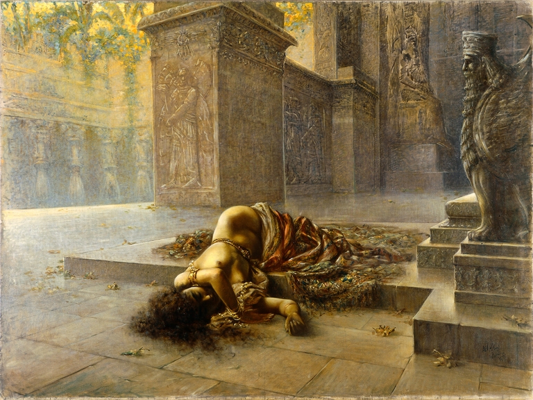 La tela fu realizzata da Augusto Valli nel 1892 al ritorno dal terzo viaggio africano per ottemperare agli obblighi del regolamento Poletti. Il tema prescelto rappresentava una novità estremamente insolita per i paludati ambienti accademici modenesi, ancorati alla tradizione di una pittura di storia a sfondo biblico o romano. La realizzazione appare tuttavia emblematica delle scelte compiute da Valli nel corso della propria carriera, diviso fra l’osservanza dei precetti accademici e la fortuna commerciale dei suoi bozzetti africani caratterizzati, questi ultimi, dalla rapida stesura di impressioni tratte dal vero. Tema, personaggi e luoghi sono certo frutto della diretta esperienza africana del pittore, ma la scena appare costruita a posteriori, in studio, nel tentativo di fornire dignità di storia alla vicenda rappresentata