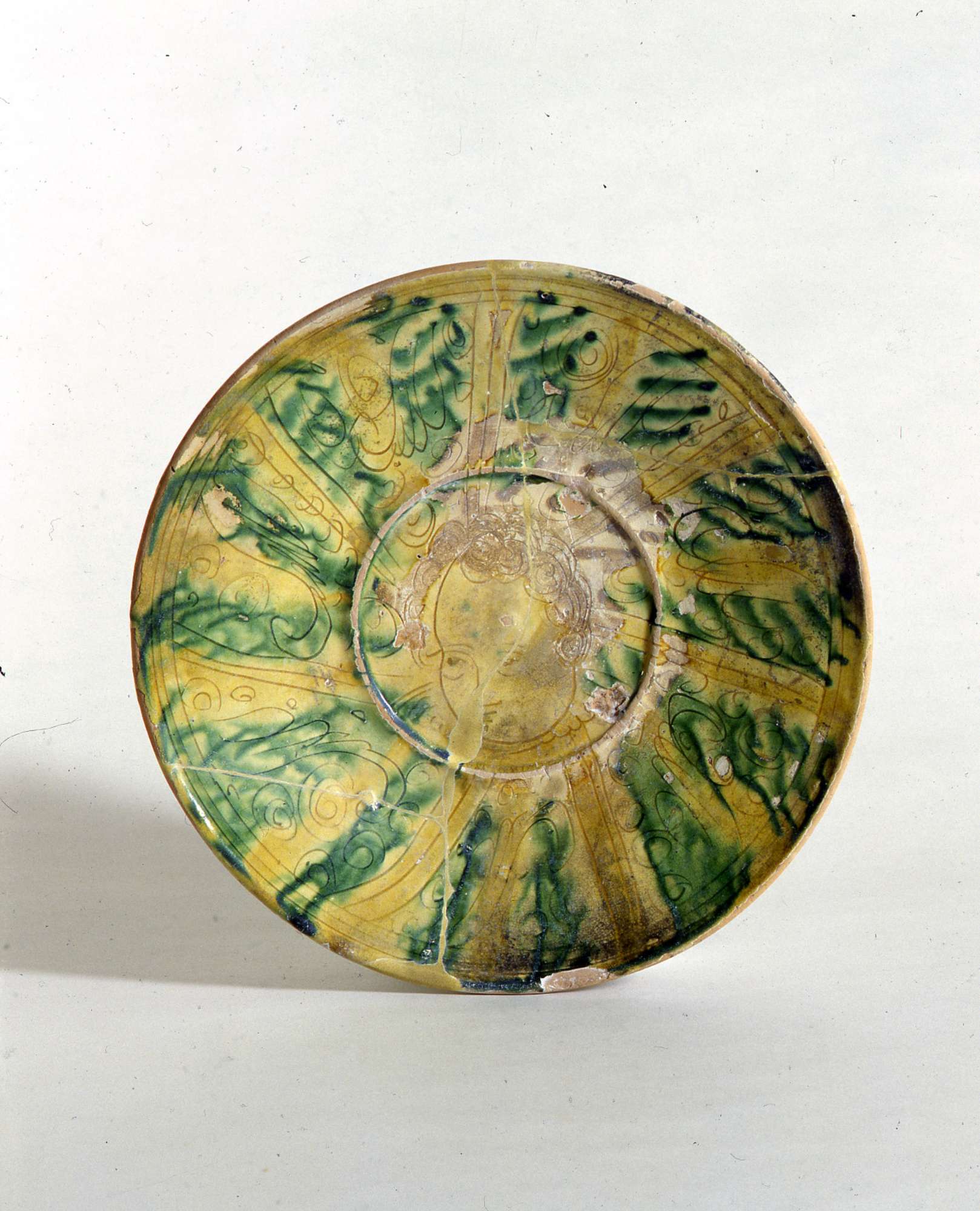 la tesa è ampia con orlo arrotondato e cavalletto molto basso. Il piede è appena accennato e leggermente incavato. La superficie è dipinta con ossidi di rame e di ferro, che si ritrovano distribuiti all'esterno. Invetriatura è trasparente, assente all'interno del piede. Il tono dell'impasto è depurato e di tonalità rosata. Al centro del cavetto si ritrova il ritratto di cherubino, il resto della superficie presenta una decorazione a raggiera con fogliami. L'opera è dipinta in bruno lionato "ferraccia" e in verde "ramina"