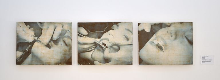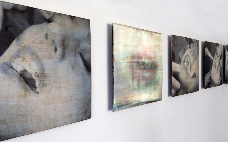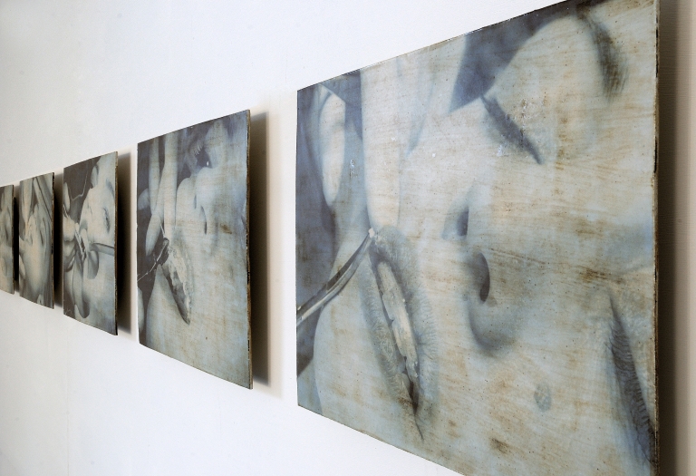 Installazione a muro di tre lastre allineate, in grès smaltato e decorato con fotoceramica sperimentale in terza cottura. Due barre in metallo incollate nel retro di ogni pezzo.
