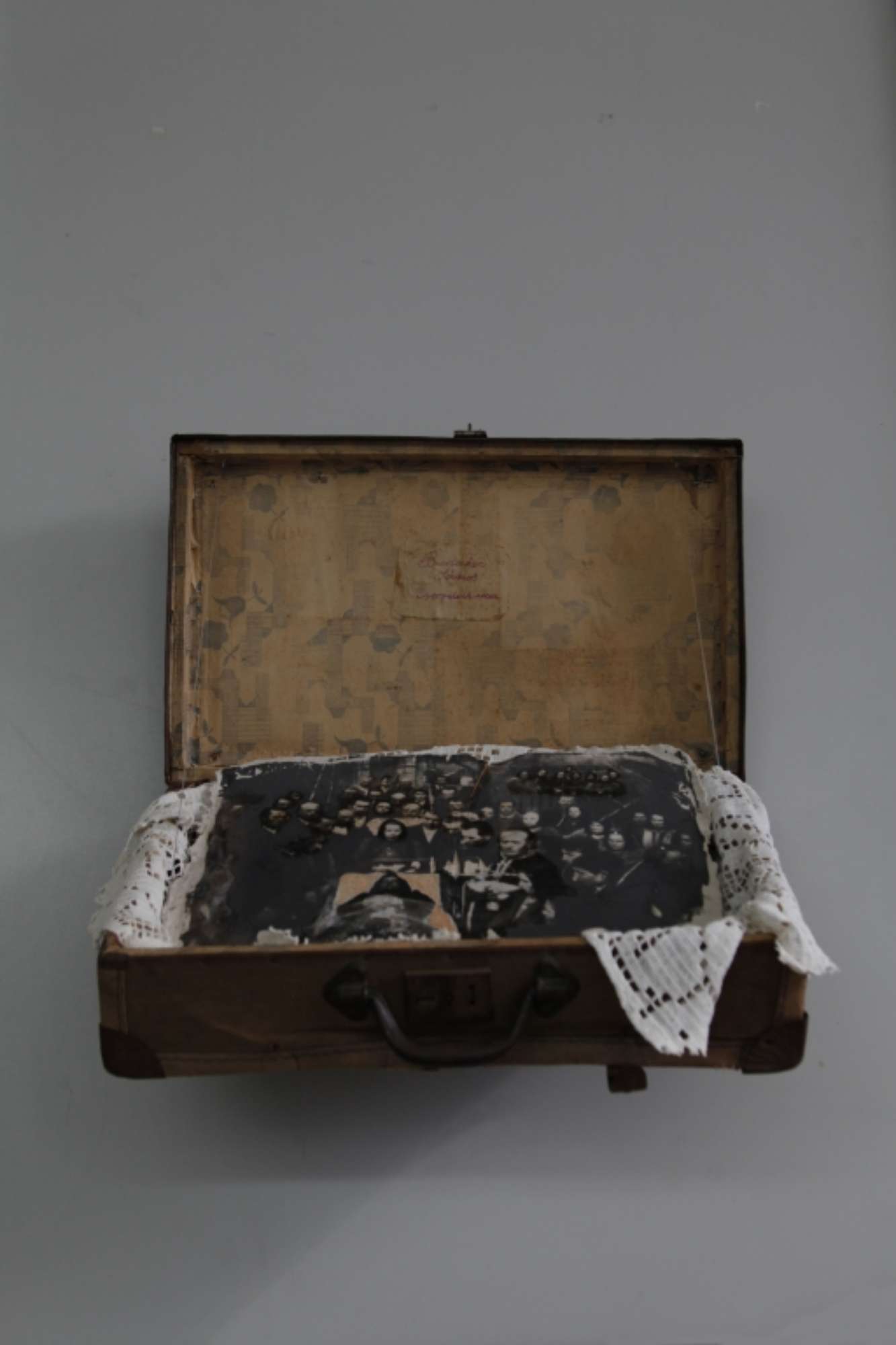 Opera costituita da una vecchia valigia aperta contenente una lastra, con immagine di un funerale, adagiata sopra una tovaglia ricamata di tradizione rumena. Lastra in porcellana (paperclay) decorata a serigrafia e con terre e vetrine colorate; valigia in cartone, tessuto e metallo.