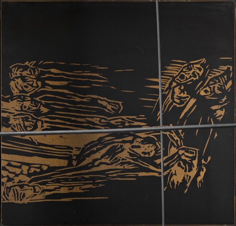 Il pannello raffigura otto figure di deportati, con una scelta e tecnica grafica che ne restituisce una immagine estremamente stilizzata.