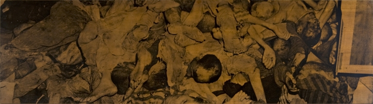 Il pannello costituisce una gigantografia e raffigura un particolare della fotografia originaria. L' immagine raffigura un ammasso di cadaveri di deportati.