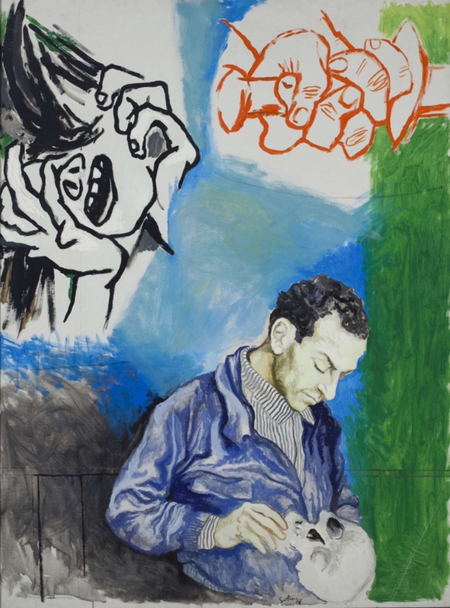 In quest’autoritratto si raffigura meditativo sulla morte, simboleggiata dal teschio ed evocata dai due grandi “frammenti” ispirati al capolavoro Guernica. Per un pittore 'politico' come Guttuso, Guernica è un momento ineludibile ed essenziale del rapporto tra la storia, l’arte e la società. Picasso non è il solo modello: l’artista siciliano si rivolge a Goya, che considera il primo dei grandi realisti moderni e a cui dedica il saggio “Goya e la guerra”, edito proprio nel 1966; studia anche la pittura dell’Ottocento francese, ammira la passione infusa da David nell’immagine di Marat, e poi Gericault e soprattutto Courbet.