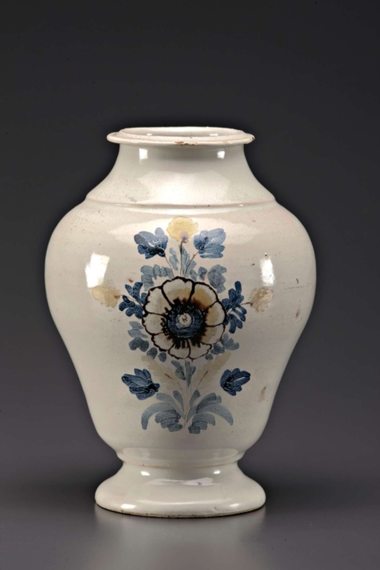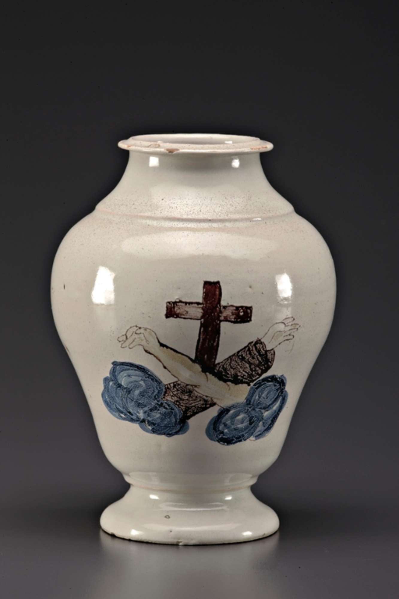 Albarello a corpo ovoidale con strozzatura inferiore, spalla modanata, breve collo con orlo estroflesso e accenno di battente, su piede svasato con modanatura all’innesto. Su una faccia è raffigurato l’emblema francescano, mentre sull’altra campeggia un mazzetto di fiori con grande corolla centrale. La decorazione è dipinta in blu, bruno e giallo su smalto di colore bianco.