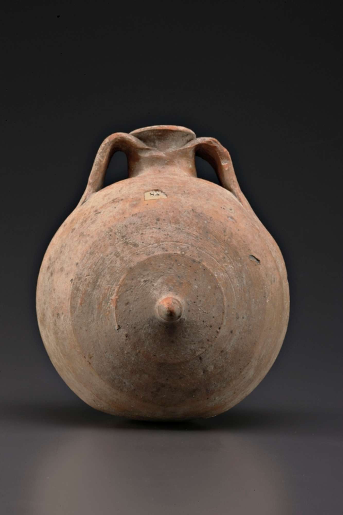 Fiasca "a mammella" con corpo globulare e faccia schiacciata sul retro; sulla zona anteriore, al centro, bottone circolare. La fiasca è munita di colletto cilindrico con orlo estroflesso, affiancato da coppia di anse nastriformi. Cordoli concentrici poco rilevati sul corpo.
