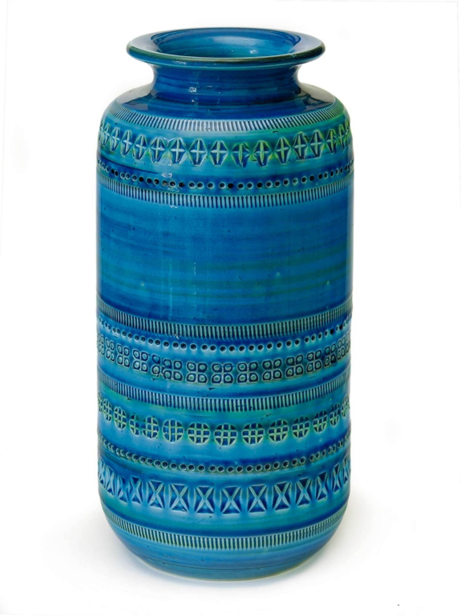 Vaso allungato, con rivestimento in color blu egizio e con rilievi nei toni dell’azzurro.