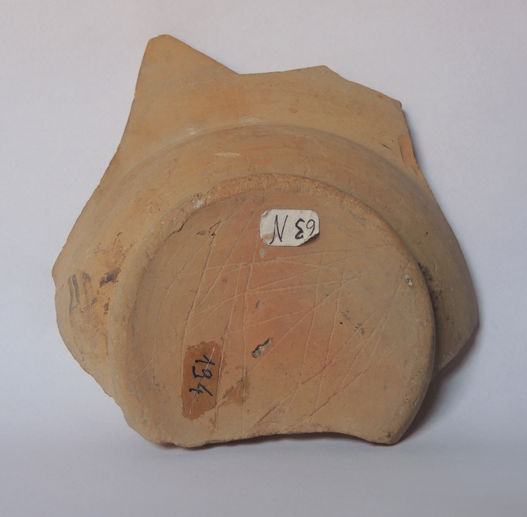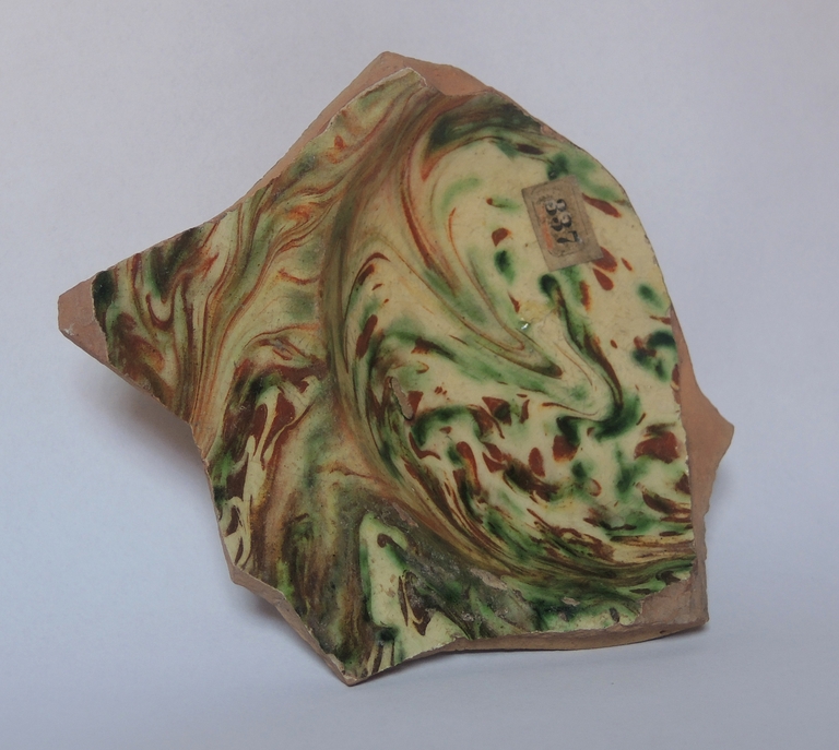 Frammento di scodella con cavetto emisferico, ampia tesa obliqua e piede a disco leggermente incavato. Il recto è decorato “a marmorizzazioni” in verde e bruno-rossiccio. Il verso è privo di rivestimento.