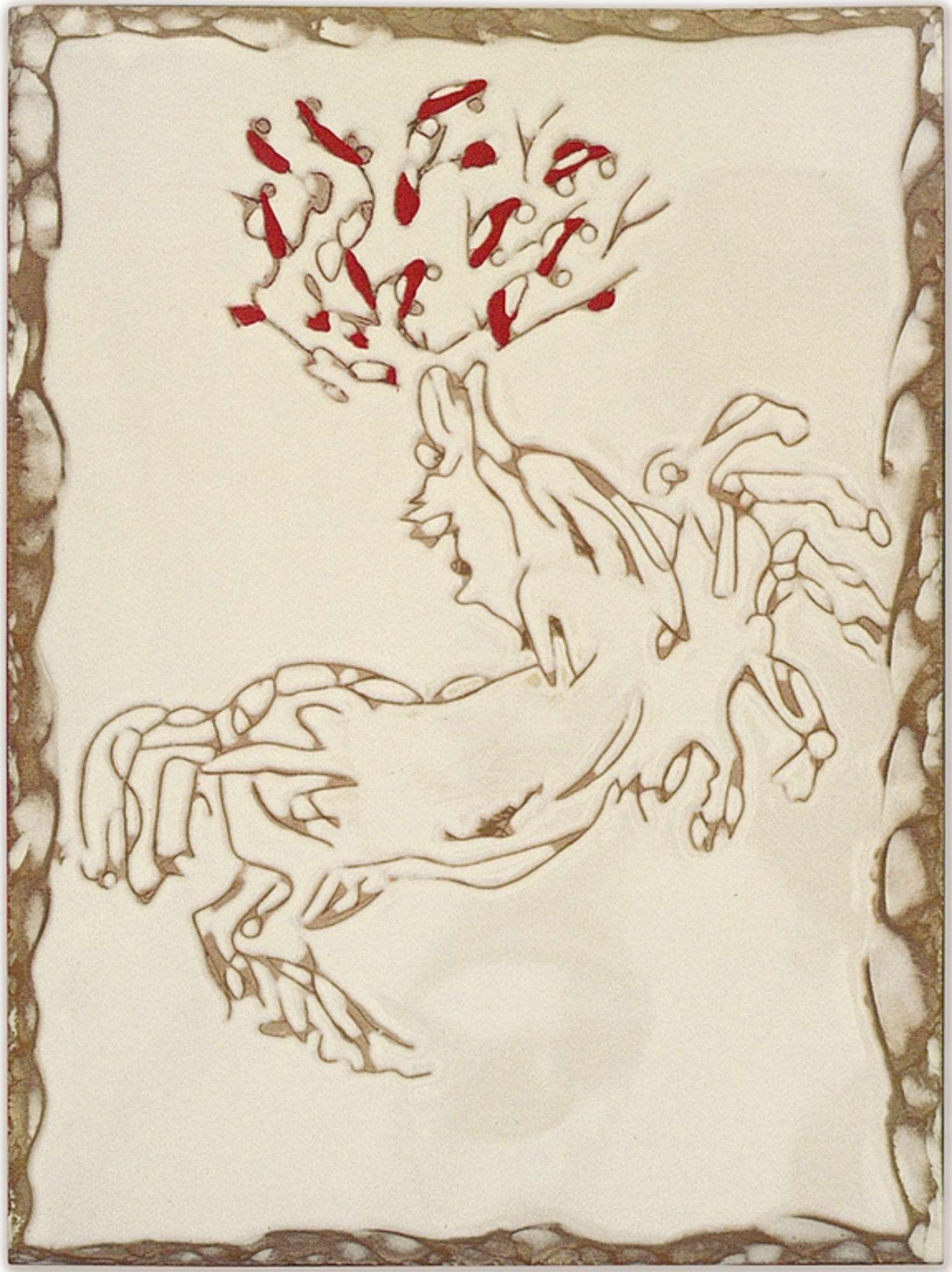 Lastra in “cotto di Rufoli” smaltata e incisa con applicazioni di colore rosso.