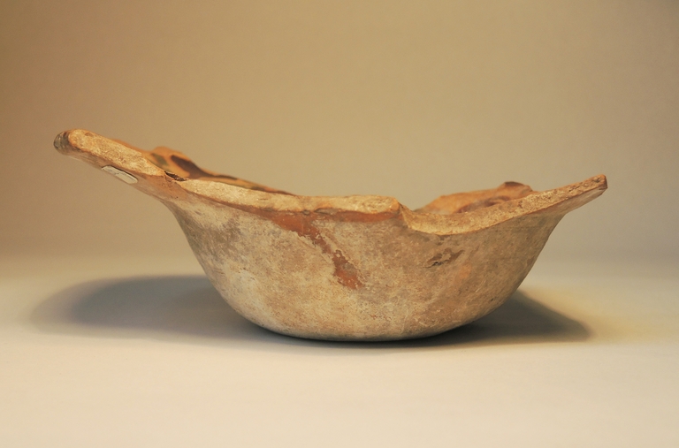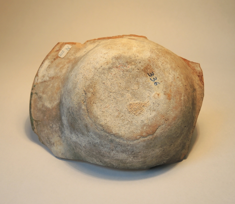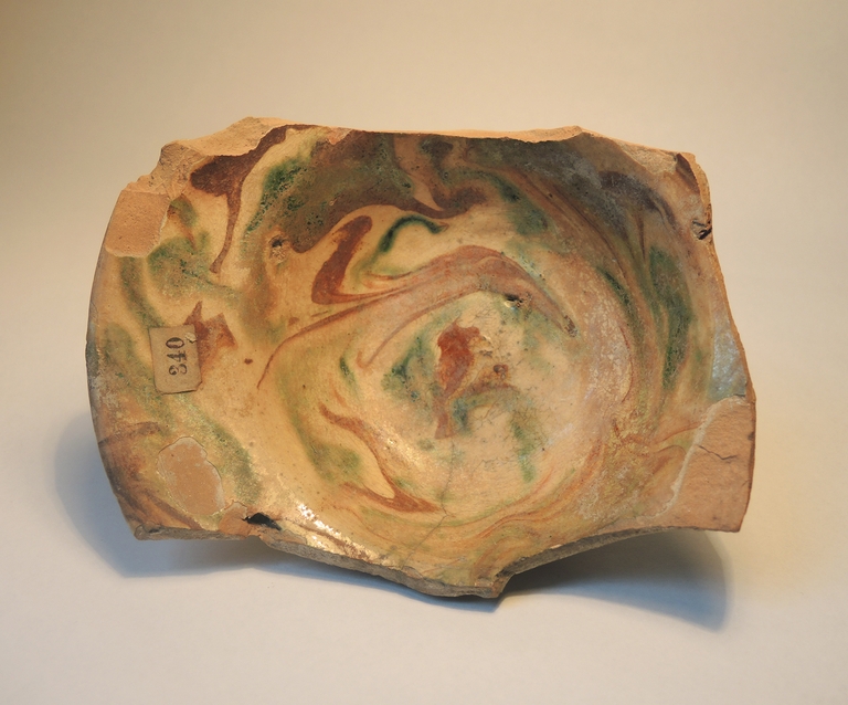 Frammento di scodella apoda con cavetto emisferico e ampia tesa obliqua con orlo arrotondato. Il recto è decorato “a marmorizzazioni” in verde-ramina e bruno rossiccio si ingobbio chiaro, sotto vetrina. Il verso è privo di rivestimento.