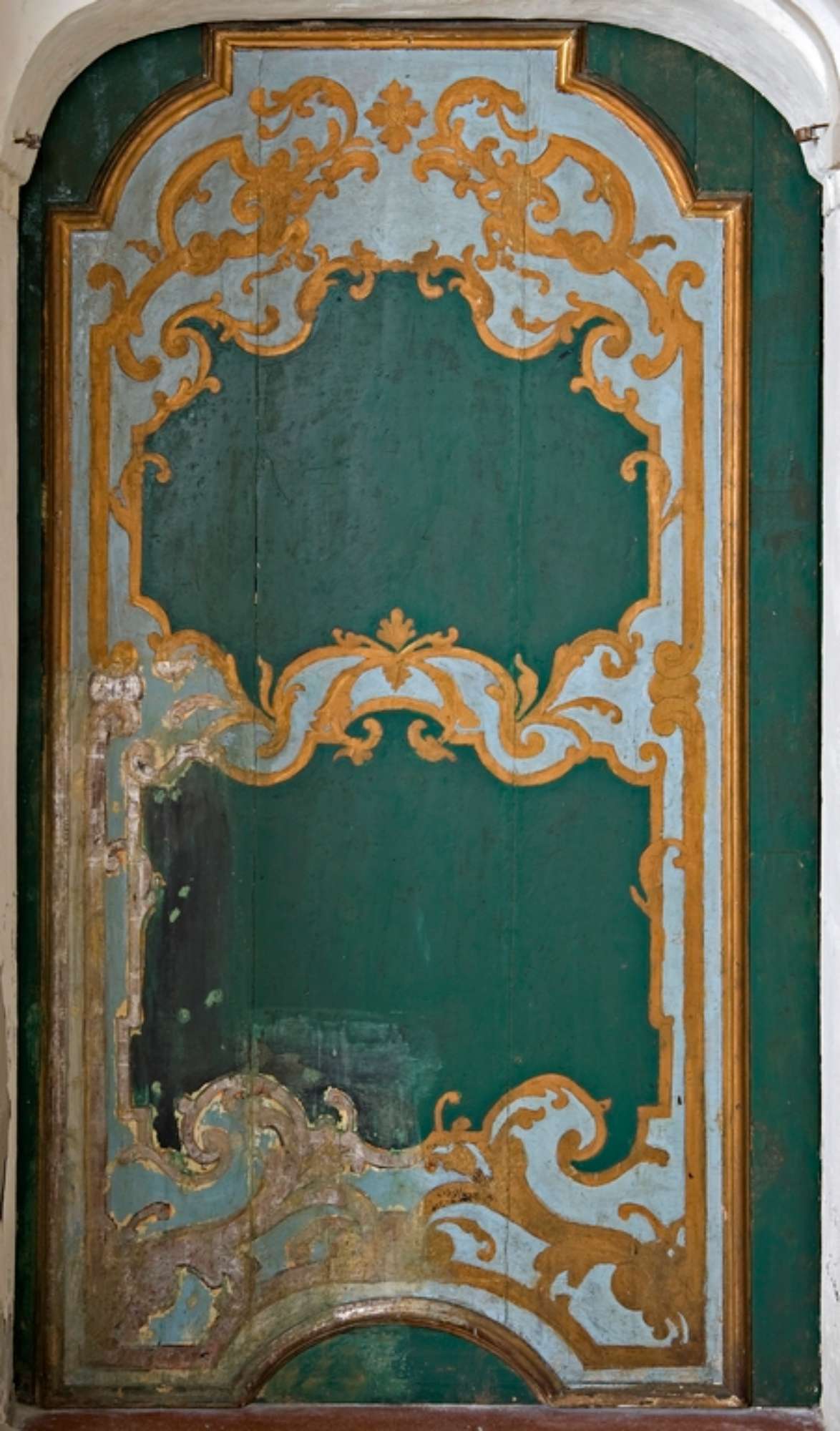 Porta ad un battente in legno dipinto. Fomdo verde e cornice modanata azzurra profilata oro.