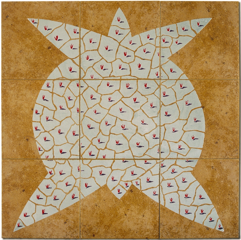 Composizione su nove piastrelle con parti smaltate e decorate su cotto a vista.