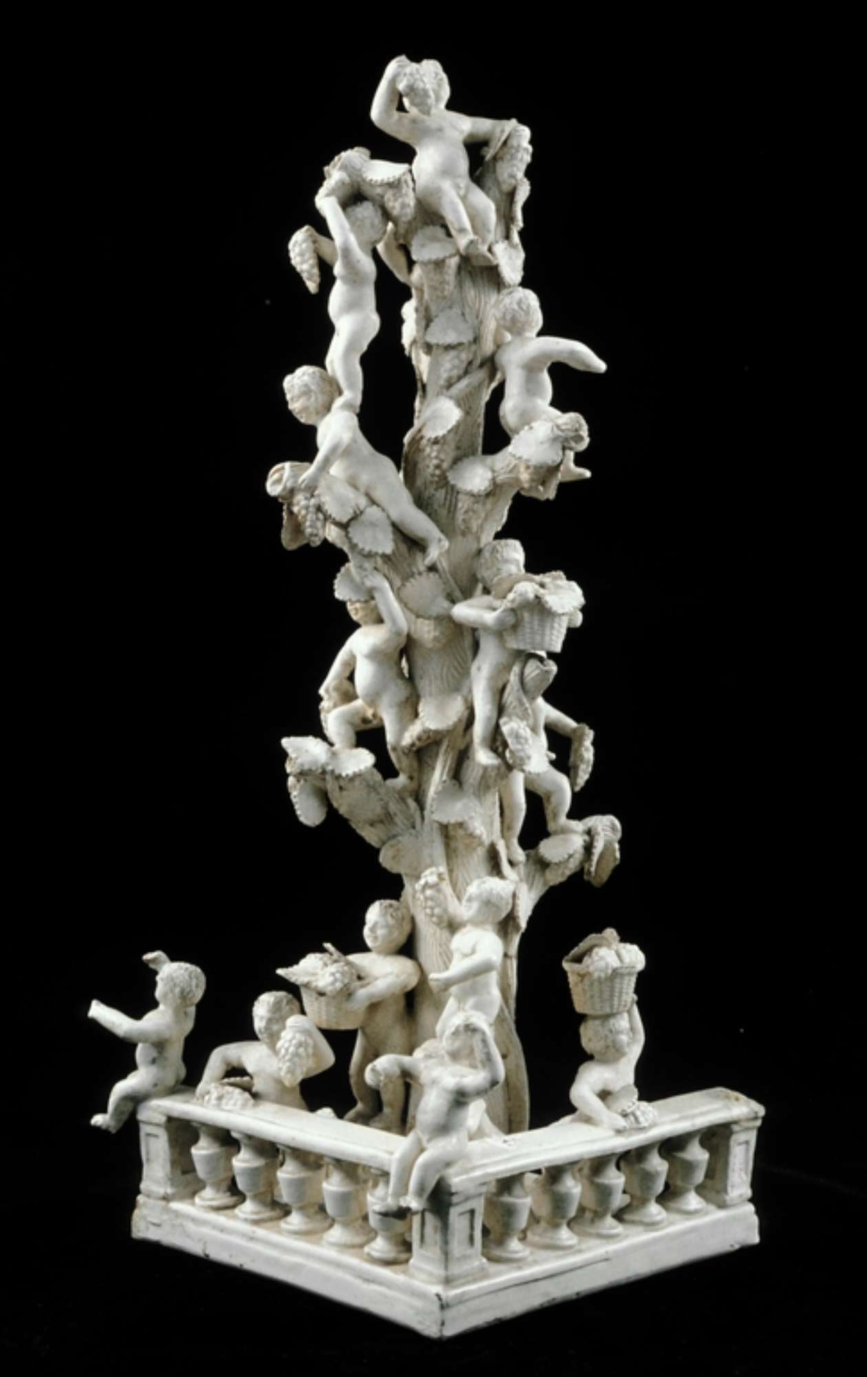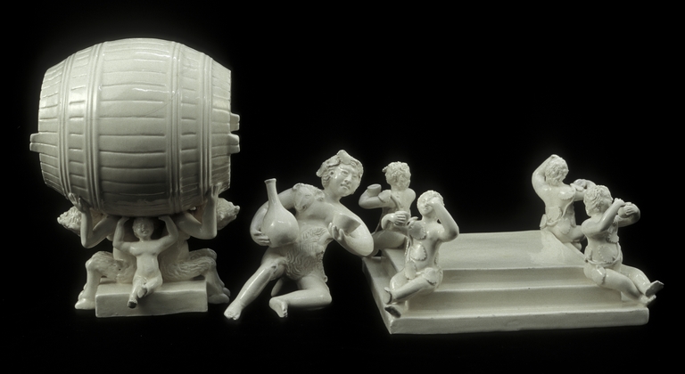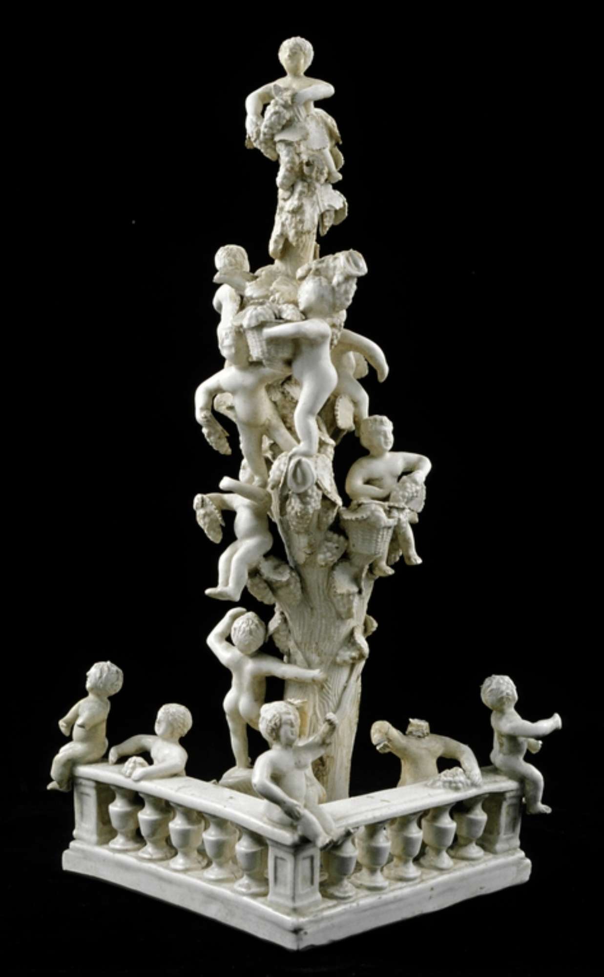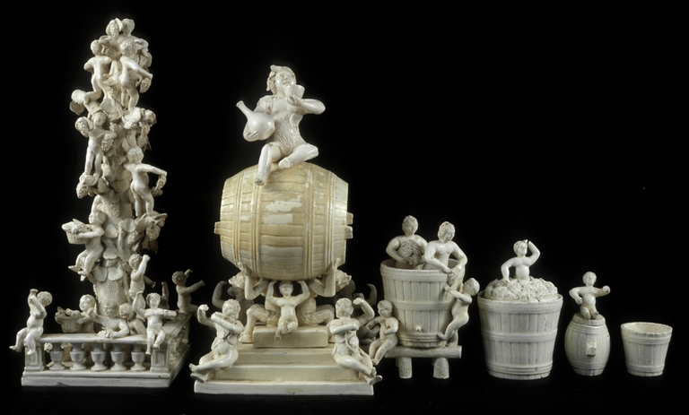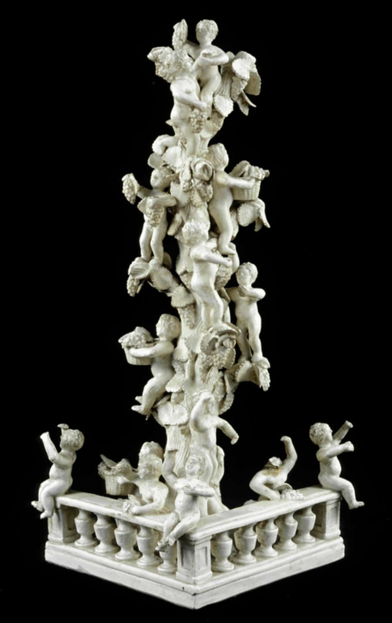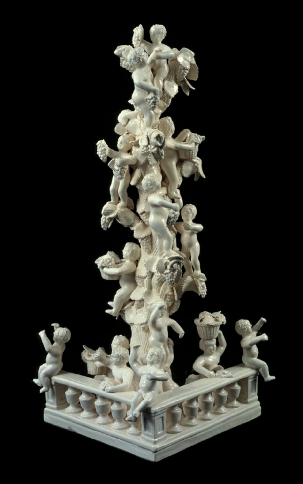Centrotavola formata da molteplici elementi raffigurante scene di un baccanale.
