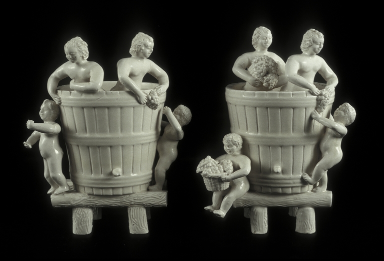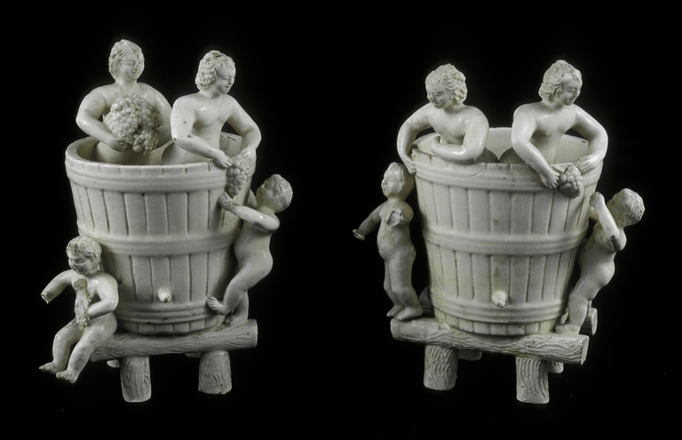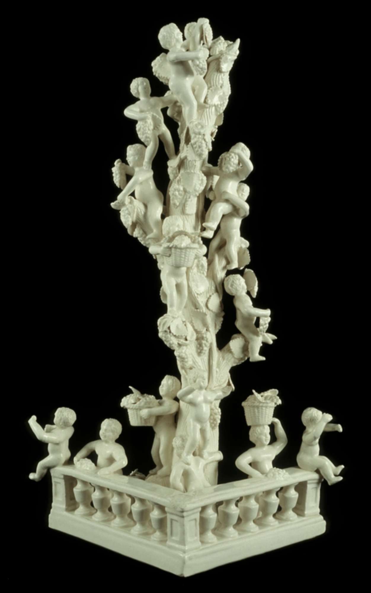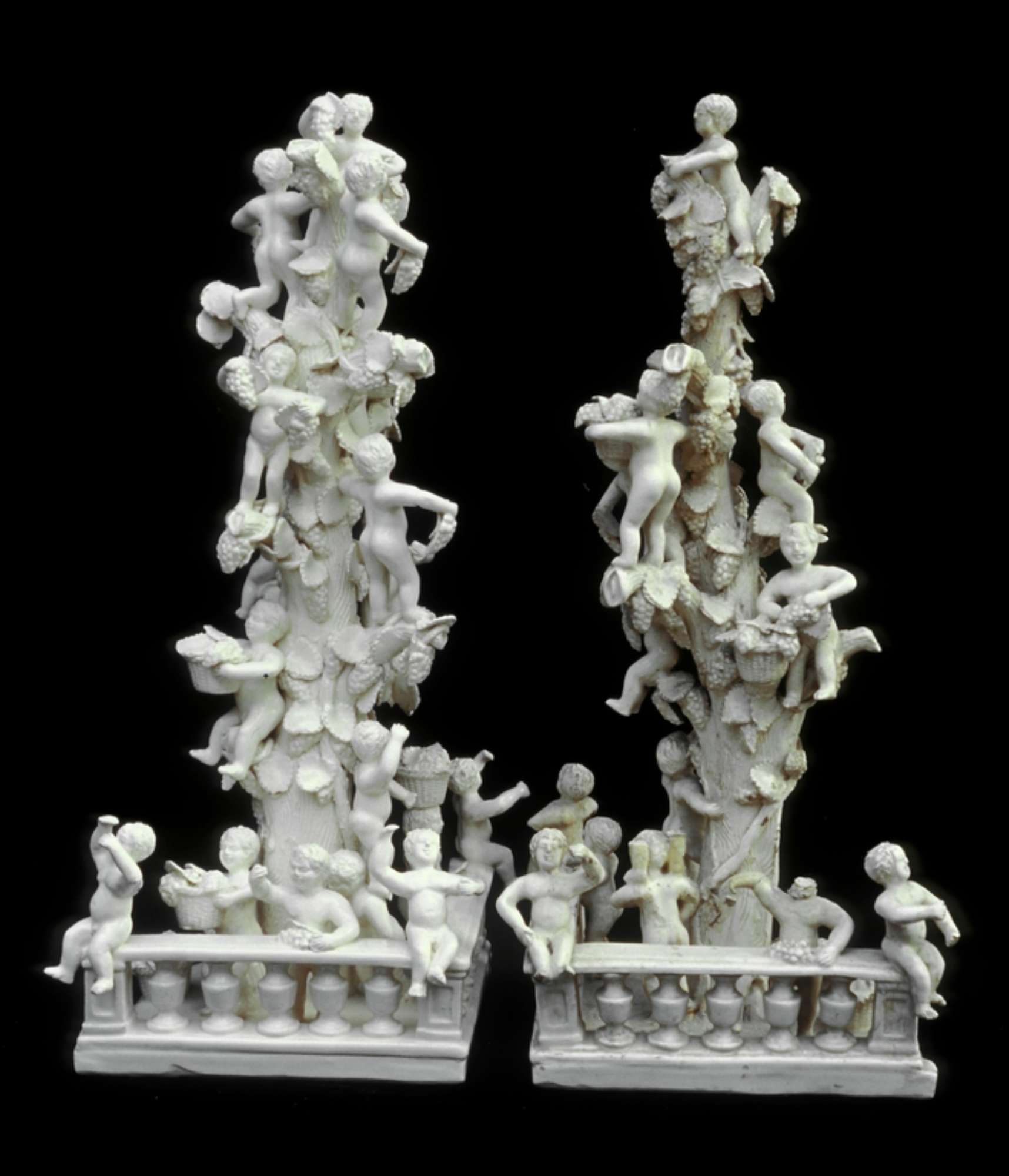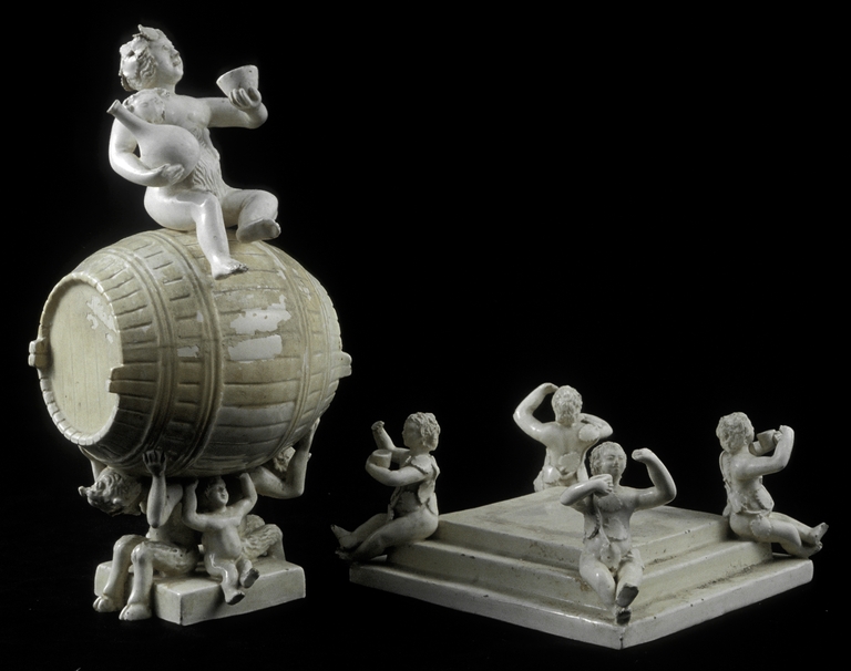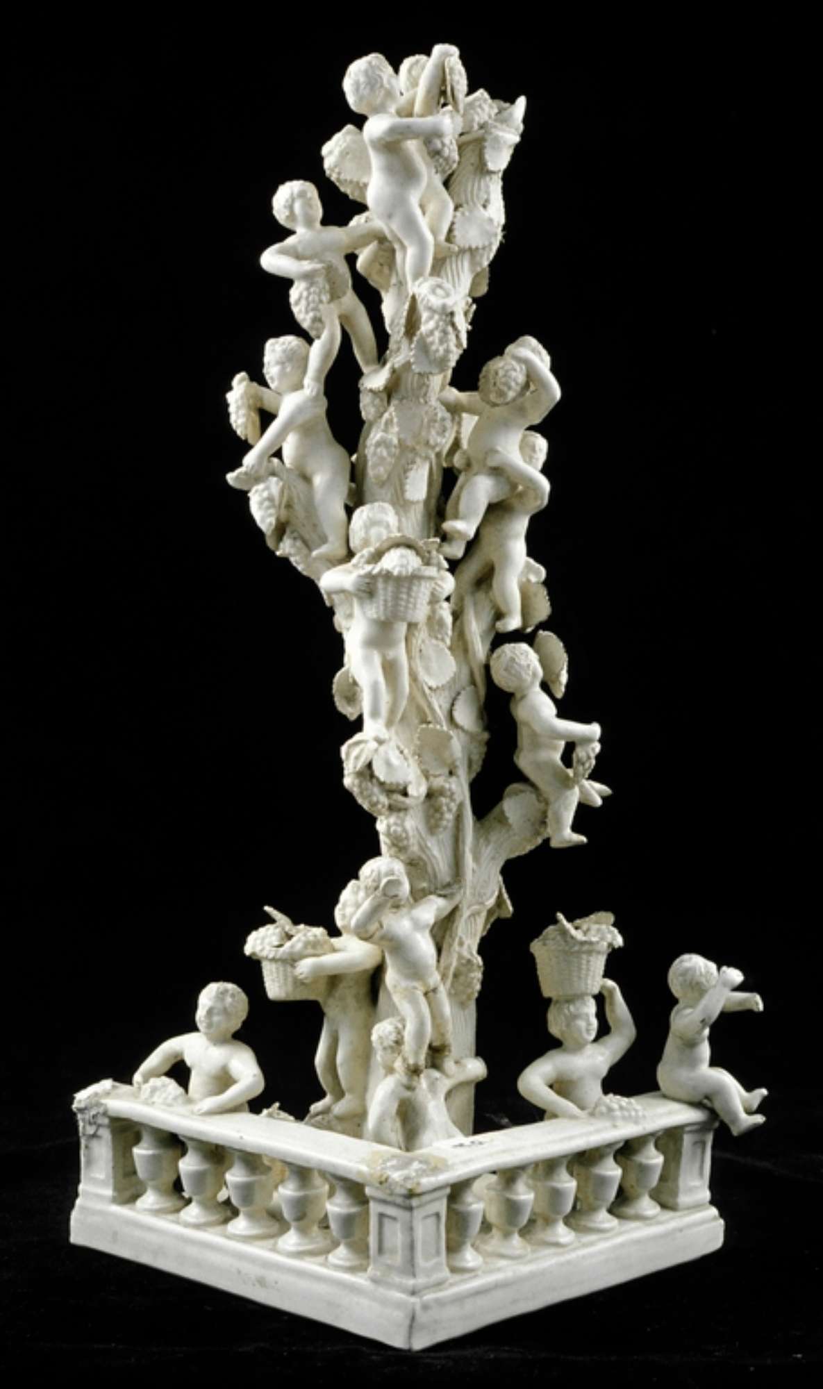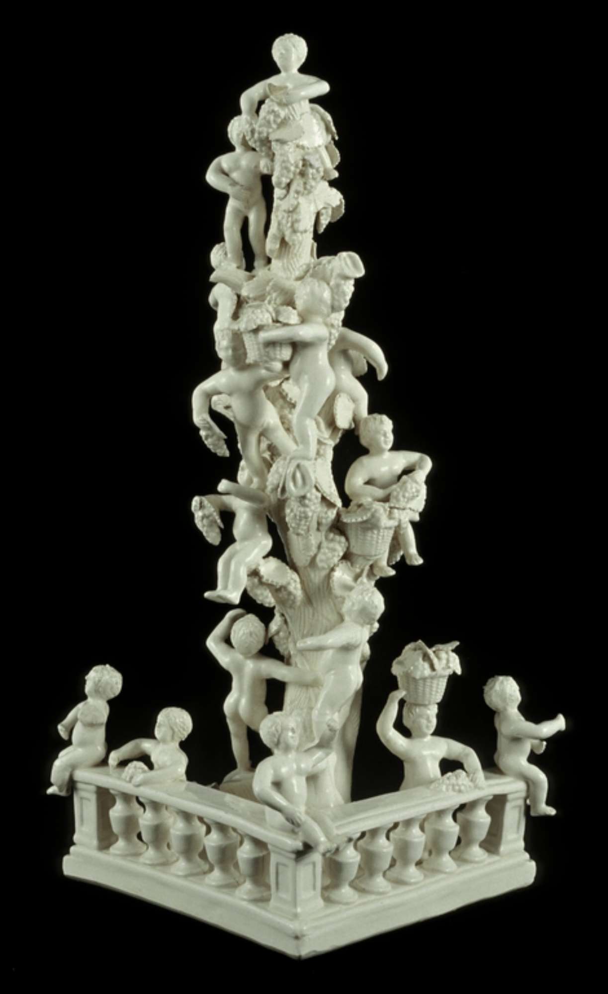Centrotavola formata da molteplici elementi raffigurante scene di un baccanale.