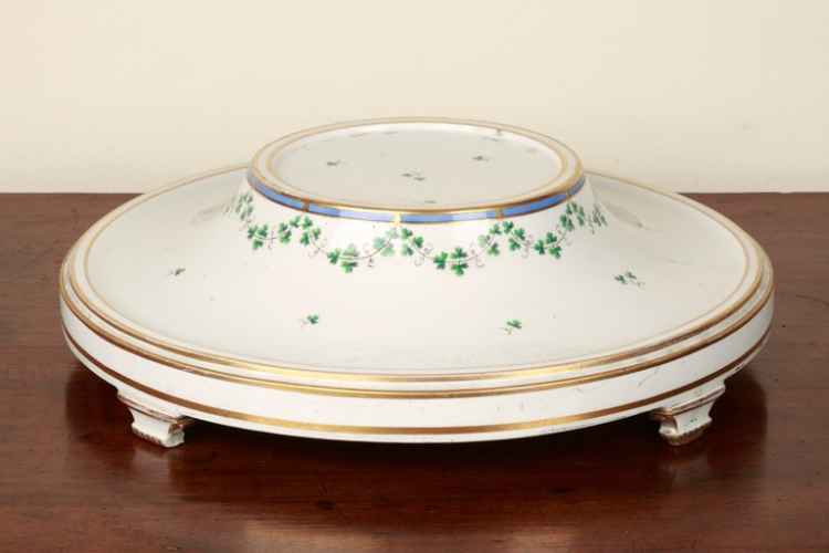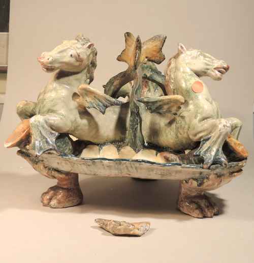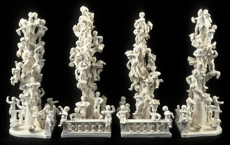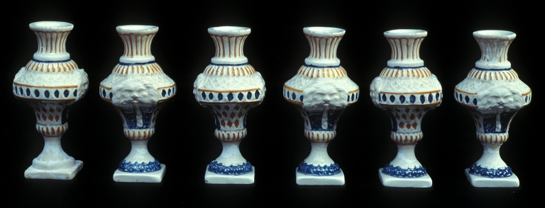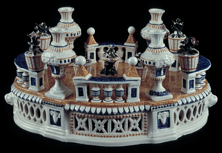Centrotavola realizzato in due parti raffigurante due terrazze con balconate e vasi.